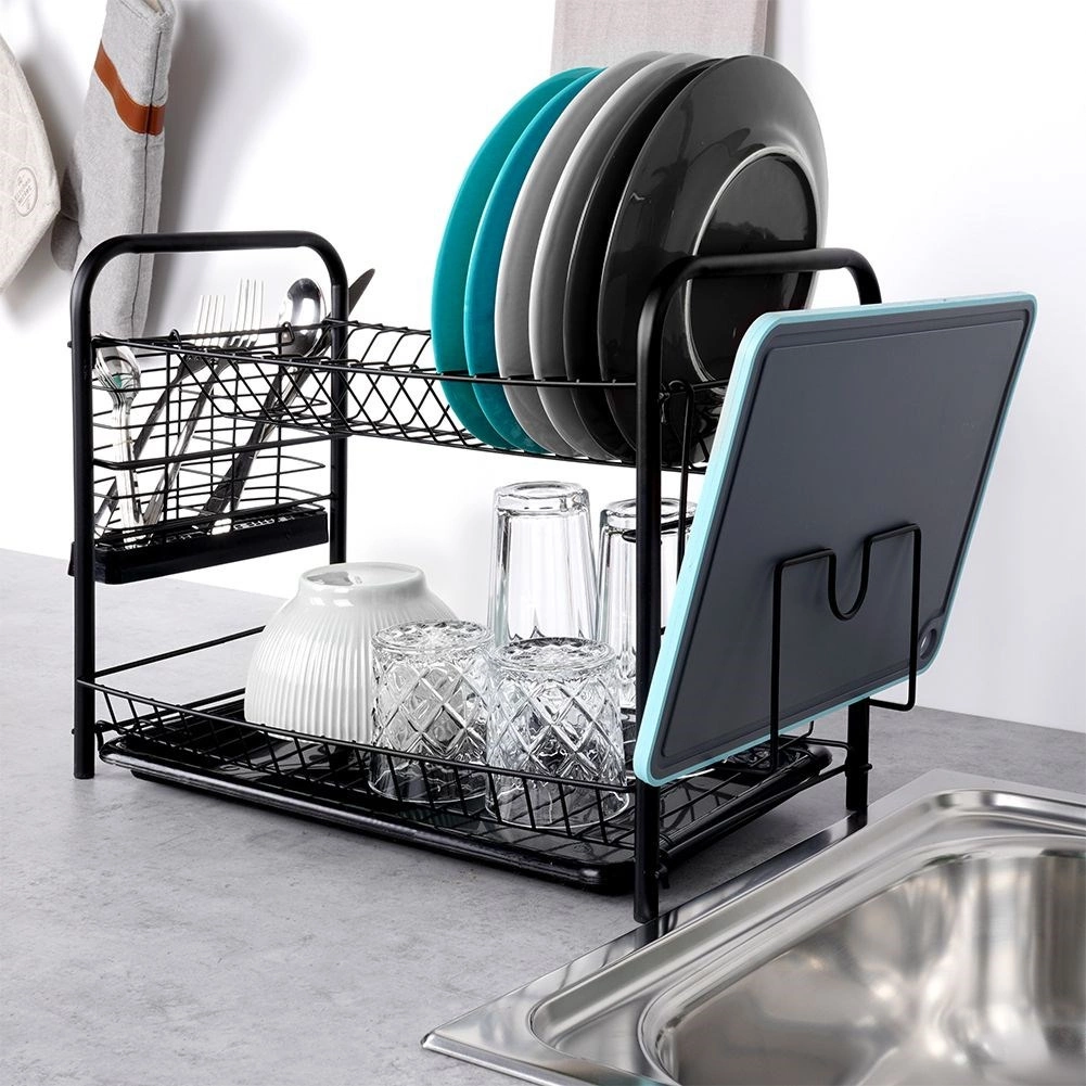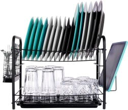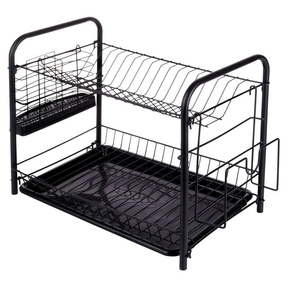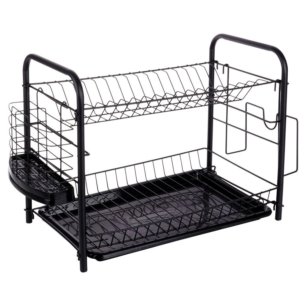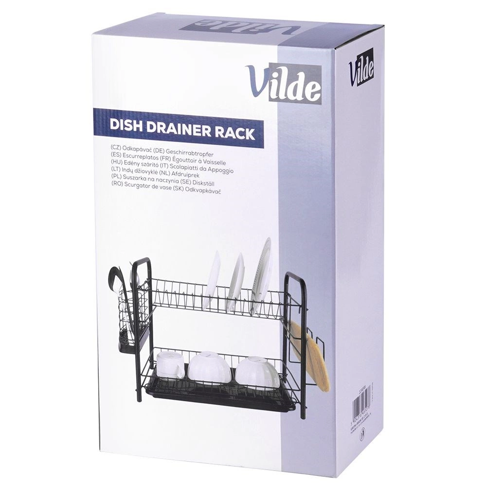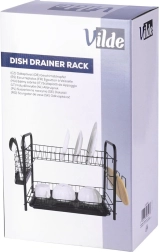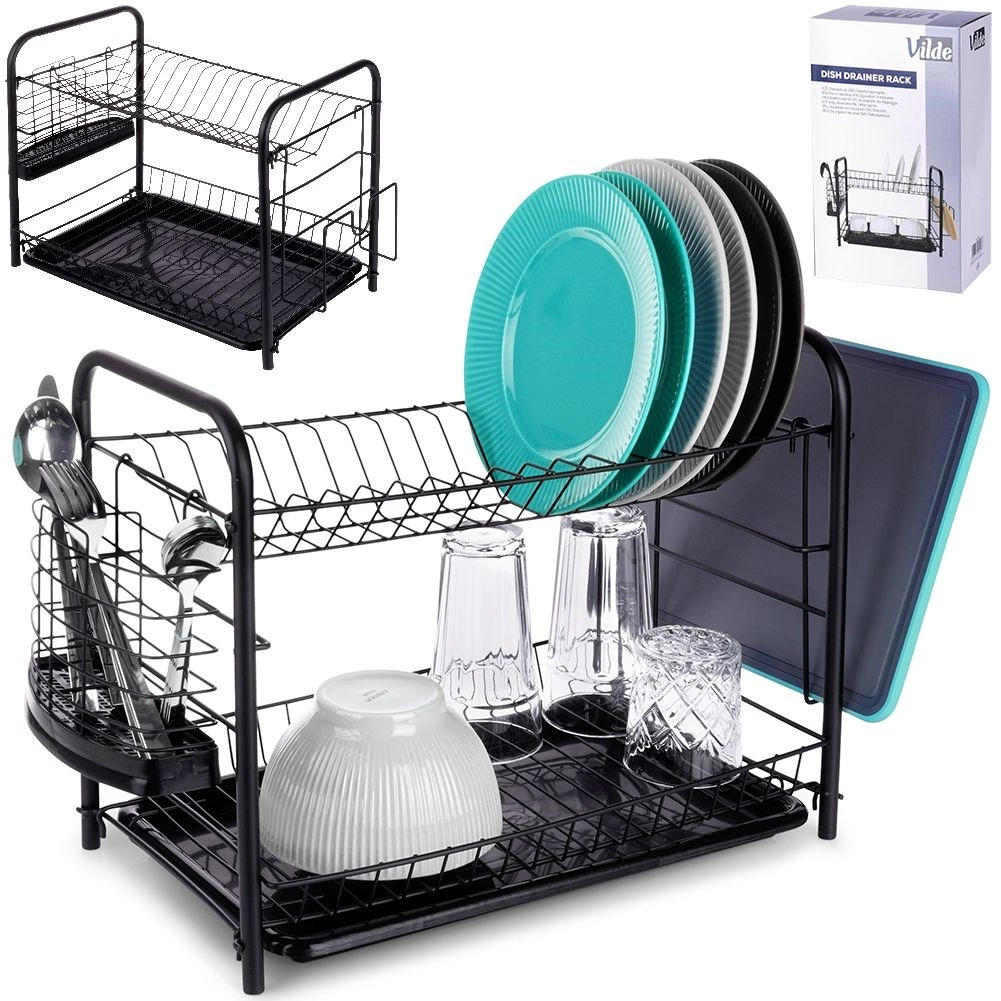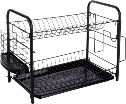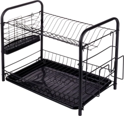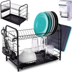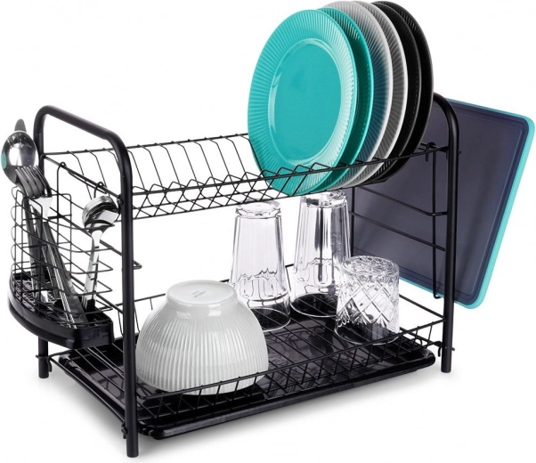Praktisks divlīmeņu trauku žāvētājs melnā krāsā ietaupa vietu uz darba virsmas un paātrina šķīvju, glāžu un galda piederumu žāvēšanu. Pateicoties diviem līmeņiem, tas ir ļoti ietilpīgs, tam ir noņemama noteces paplāte, dēlīša turētājs un atsevišķs grozs galda piederumiem. Izturīga metāla konstrukcija industriālā stilā nodrošina ilgmūžību un stabilitāti.