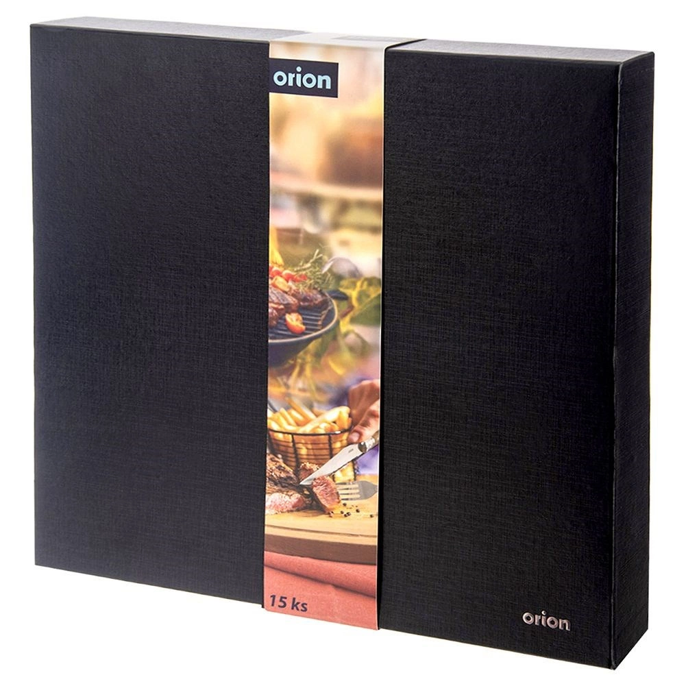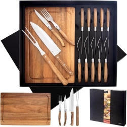 Pilns komplekts gaļas un grilēšanas cienītājiem: 15 daļīgs steika piederumu komplekts ar asām zobainām nažiem, masīvu akācijas koka dēlīti un servēšanas rīkiem. Ergonomiski koka rokturi, kvalitatīvs nerūsējošais tērauds un elegants dāvanu iepakojums padara to par lielisku izvēli gan mājsaimniecībām, gan gastronomijai.