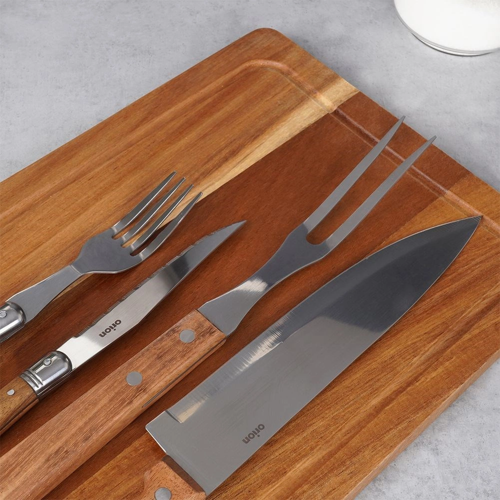Šis daudzpusīgais komplekts apvieno precīzu griešanu un stilīgu servēšanu. Zobainie nerūsējošā tērauda asmeņi lieliski tiek galā ar steikiem, burgeriem un picu, bet pavāra nazis un gaļas dakša atvieglo porcionēšanu. Ergonomiskie akācijas koka rokturi ar trīskāršu kniedējumu nodrošina stingru un ērtu satvērienu.