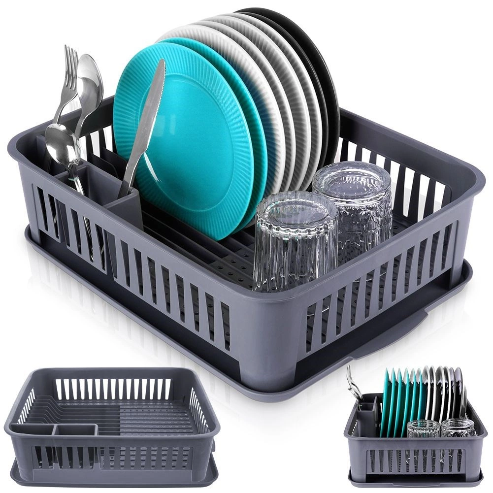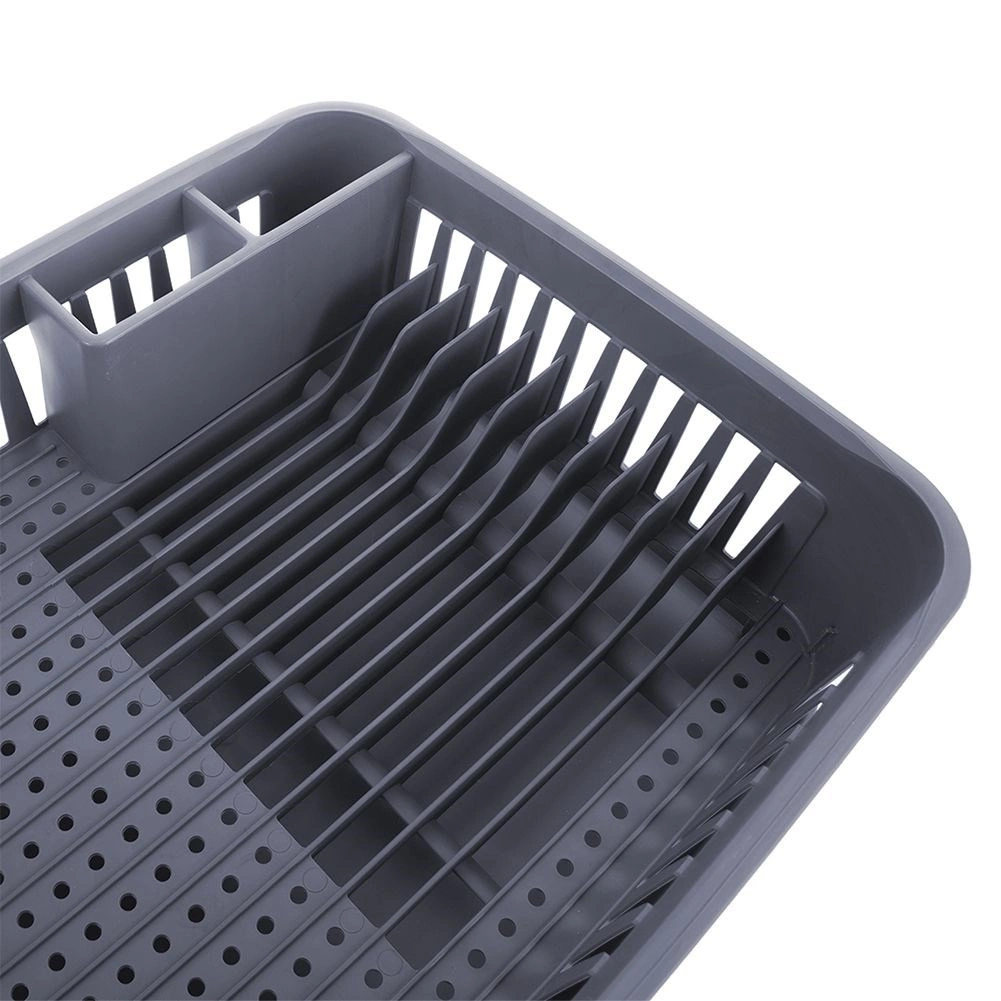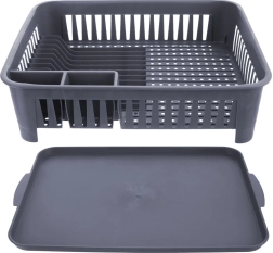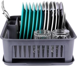 Praktisks pelēks trauku žāvētājs ar izmēriem 43,5 × 32 × 12 cm palīdz uzturēt izlietni un darba virsmu sausumā un kārtībā. Piedāvā vietu līdz 12 šķīvjiem, vietu krūzēm un glāzēm un divus nodalījumus galda piederumiem. Pateicoties izņemamai noteces paplātei, to ir viegli tīrīt; tas ir viegls un izturīgs – ideāli piemērots gan modernai, gan klasiskai virtuvei.
