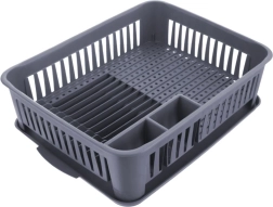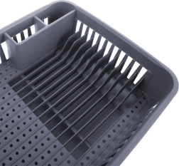 Uzturiet savu virtuvi tīru un organizētu. Šis pelēkais trauku žāvētājs ir izgatavots no kvalitatīva, izturīga plastmasas materiāla, un pateicoties kompaktajiem izmēriem, tas der lielākajai daļai virtuves virsmu. Izņemamā noteces paplāte savāc ūdeni un pasargā darba virsmu, savukārt pārdomātais izkārtojums nodrošina ātru un higiēnisku trauku žāvēšanu.