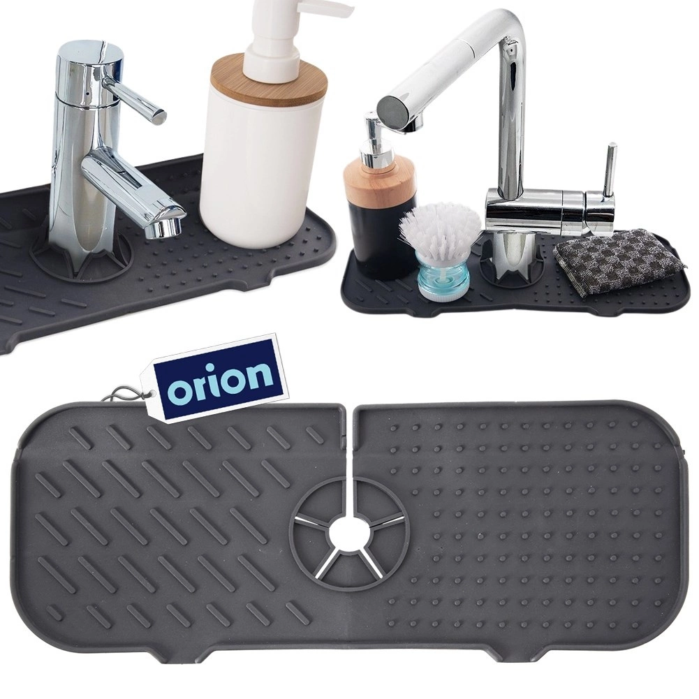 Uzturiet tīrību un sausumu ap izlietni un vannas istabā. Silikona paliktnis ar praktisku izgriezumu ap jaucējkrānu notver pilienus, novada ūdeni atpakaļ izlietnē un vienlaikus kalpo kā organizētājs sūkļiem, birstēm vai dozatoriem. Aizsargā virsmu no mitruma, netīrumiem un kaļķakmens nogulsnēm.