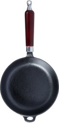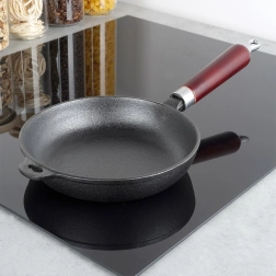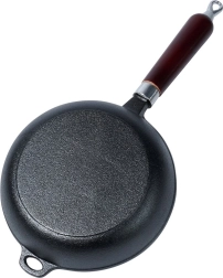 Universāla čuguna panna 20 cm cepšanai, cepetim un sautēšanai uz visiem plīts veidiem, arī uz indukcijas, uz grila un tieši virs uguns. Masīvais čuguns lieliski uzkrāj siltumu, nodrošina vienmērīgu izcepšanu un saglabā ēdienu ilgi siltu. Ergonomisks koka rokturis un palīgausi drošai satveršanai, iespēja pakarināt. Bez ķīmiskām pārklājumu apstrādēm, pareizi kopjot — īpaši izturīga un ilgmūžīga.