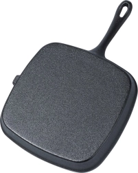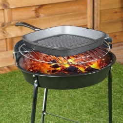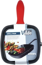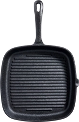 Kvadrātveida čuguna grilpanna ar praktisku sarkanu silikona uzmavu drošai pārnēsāšanai. Piedāvā ātru un vienmērīgu uzsildi, augstu siltuma akumulāciju un rievotu virsmu autentiskām svītrām un tauku novadīšanai. Piemērota gāzei, elektrībai, keramikai, halogēnam un indukcijai, cepeškrāsnij, kā arī atklātai liesmai un grilam.