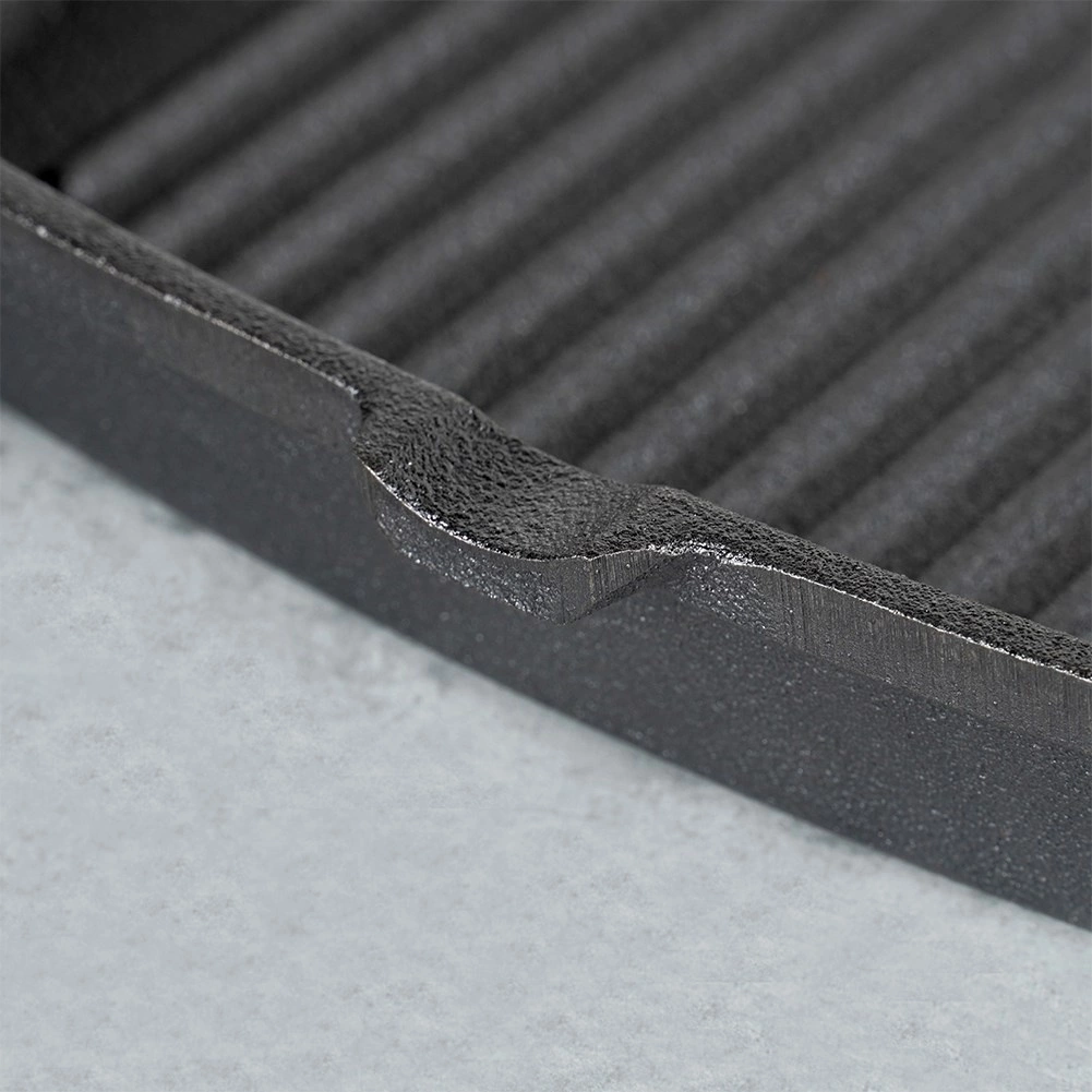 Šī robustā čuguna panna 24,5 × 24 cm ir radīta perfekti izceptiem steikiem, dārzeņiem un kartupeļiem. Masīvais čuguns vienmērīgi uzsilst, ilgi saglabā siltumu, un ēdieni paliek silti ilgāku laiku. Rievotā virsma veido izteiktas grila svītras un nodrošina liekā tauku daudzuma novadīšanu.