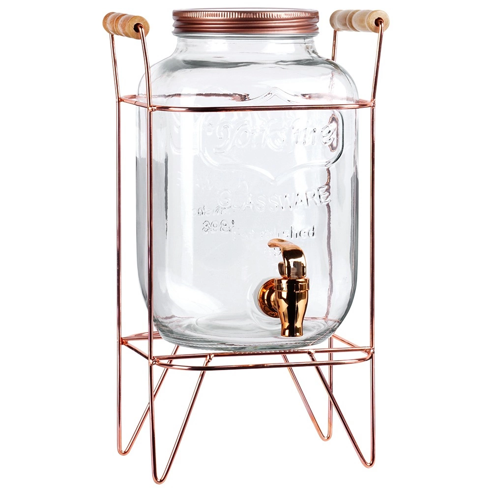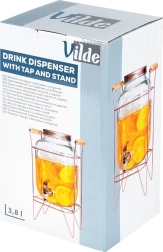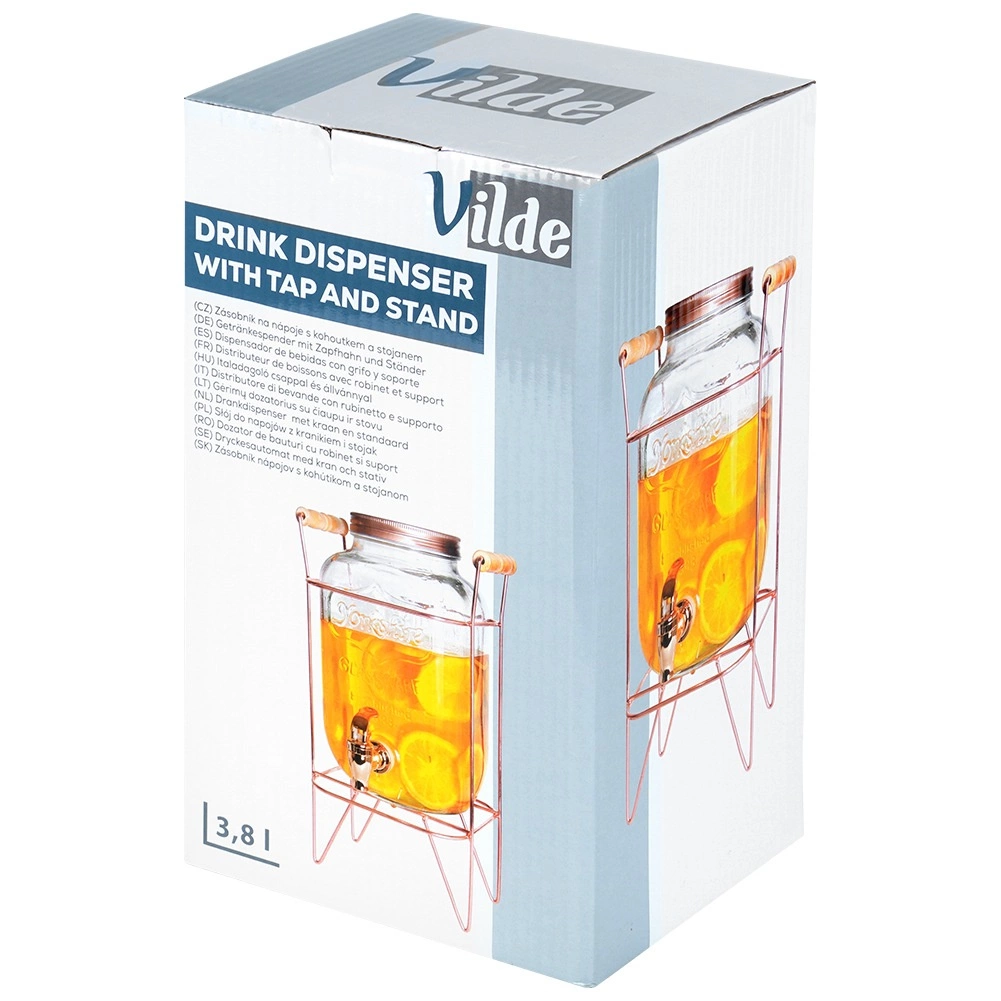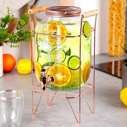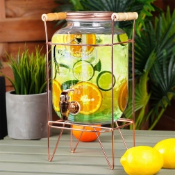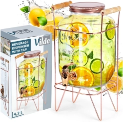 Elegantais stikla dzērienu dozators ar tilpumu 4,2 l uz stabila statīva rožu zelta krāsā un ar praktisku krāniņu ērtai pasniegšanai. Ideāli piemērots limonādēm, punšiem, augļu ūdeņiem un ledus tējām svinībās, grilēšanās un ģimenes tikšanās reizēs. Plata atvere atvieglo leda un augļu pievienošanu, bet uzskrūvējams vāciņš pasargā dzērienu no kaitēkļiem.