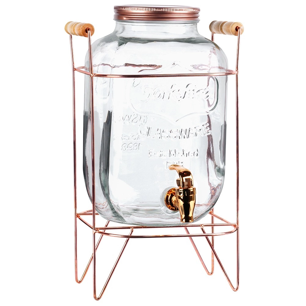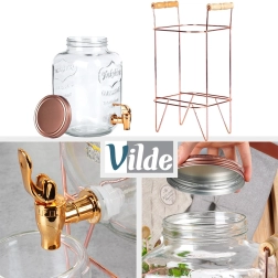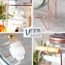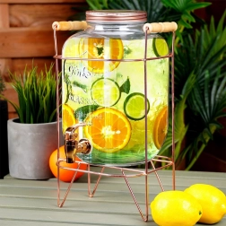 Šis stilīgais dzērienu dozators apvieno izturīgu biezu stiklu ar stabilu metāla konstrukciju rožu zelta tonī un koka rokturiem ērtai pārnēsāšanai. Praktisks krāniņš ļauj vienmērīgi liet bez šļakatām, bet skrūvējams vāciņš uztur saturu tīru un pasargātu. Lieliska izvēle dārza ballītēm, ģimenes svinībām un cateringam.