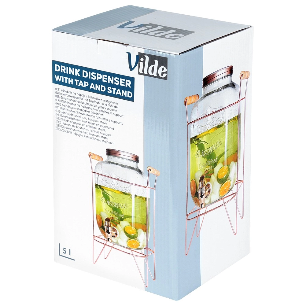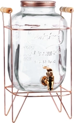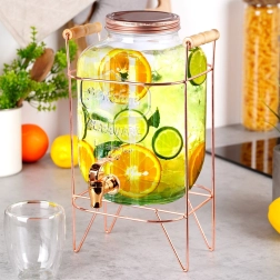 Elegantais stikla dzērienu dozators ar tilpumu 5,5 l uz stabila metāla statīva rožu zelta krāsā ir ideāli piemērots limonādēm, ūdenim, ledus tējai un punšam. Pateicoties krāniņam ar blīvējumu, lietošana ir ērta un tīra, bet skrūvējams vāks pasargā dzērienu no kukaiņiem, un caurspīdīgs, biezs stikls ar reljefu stilīgi izceļ augļus un ledu.