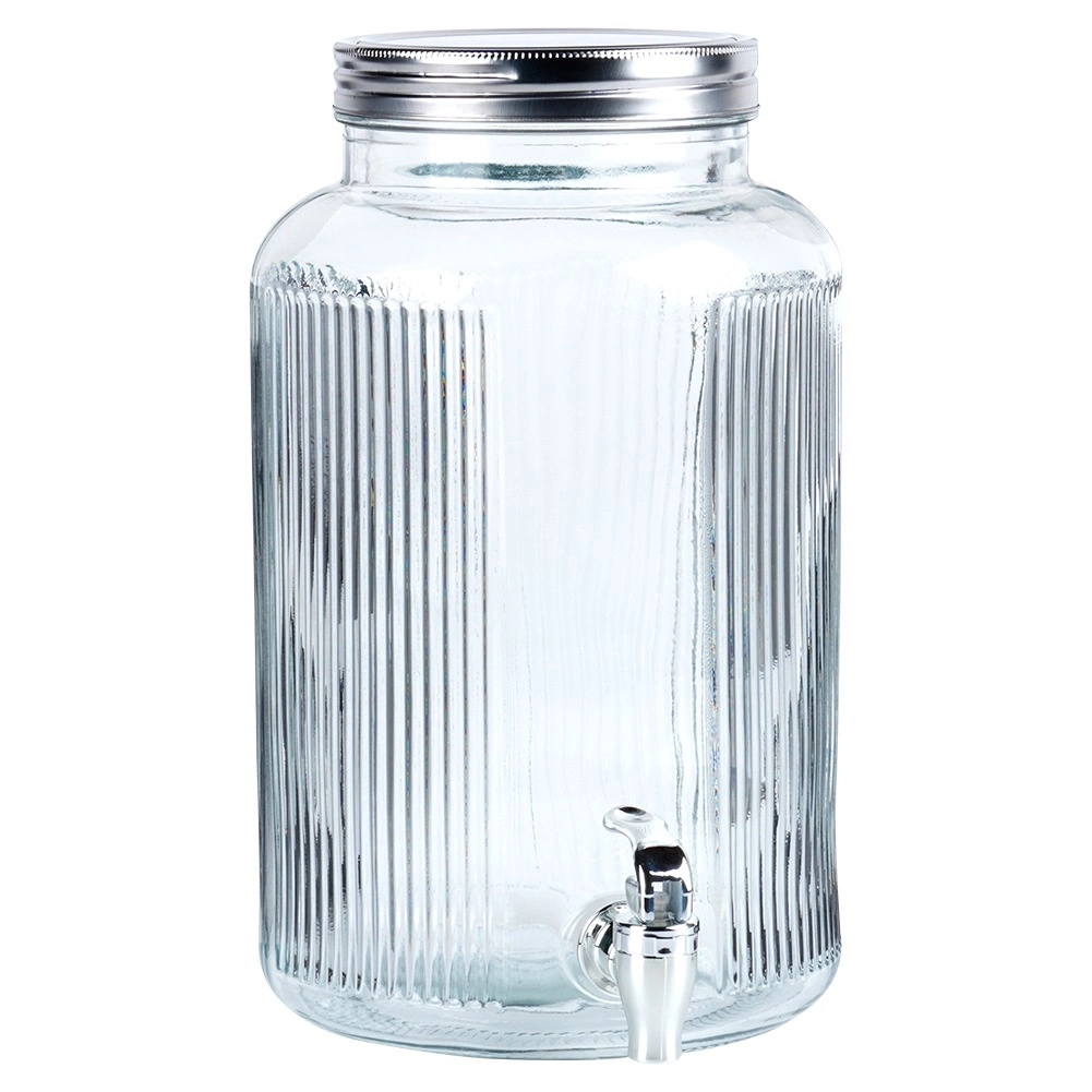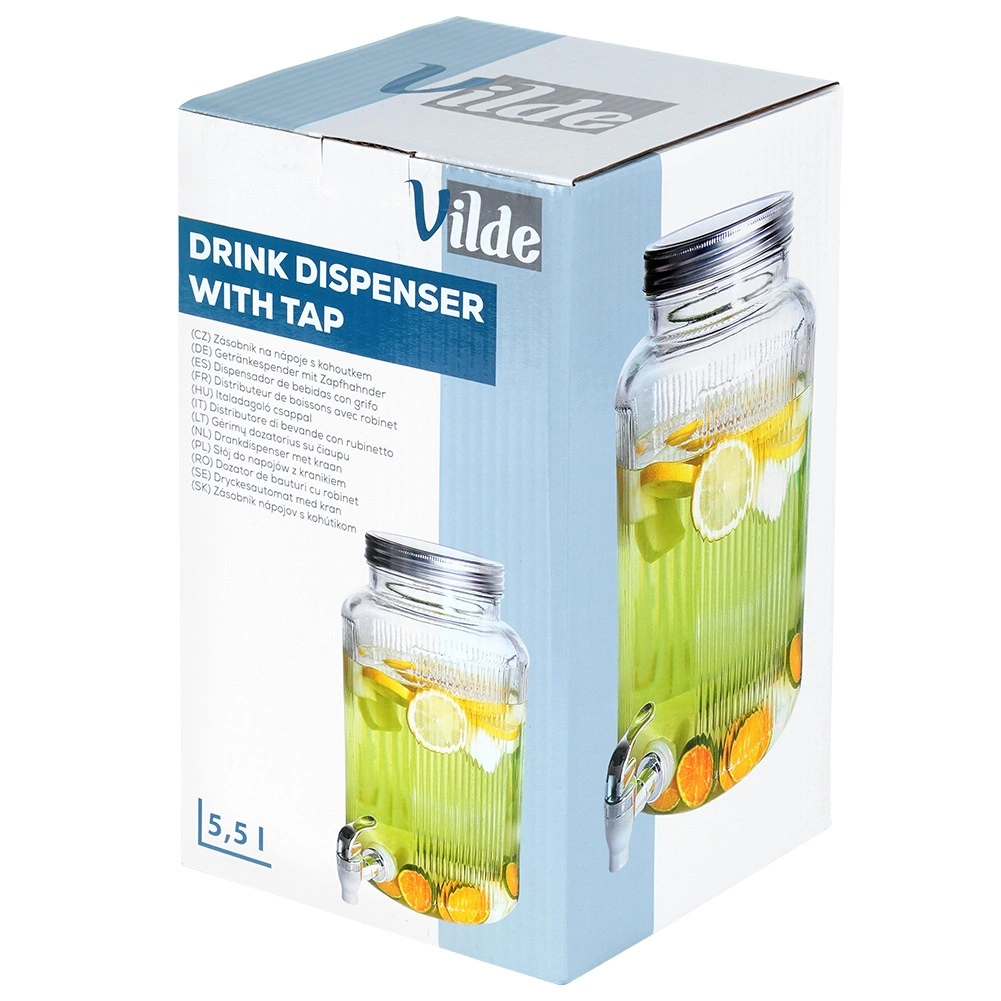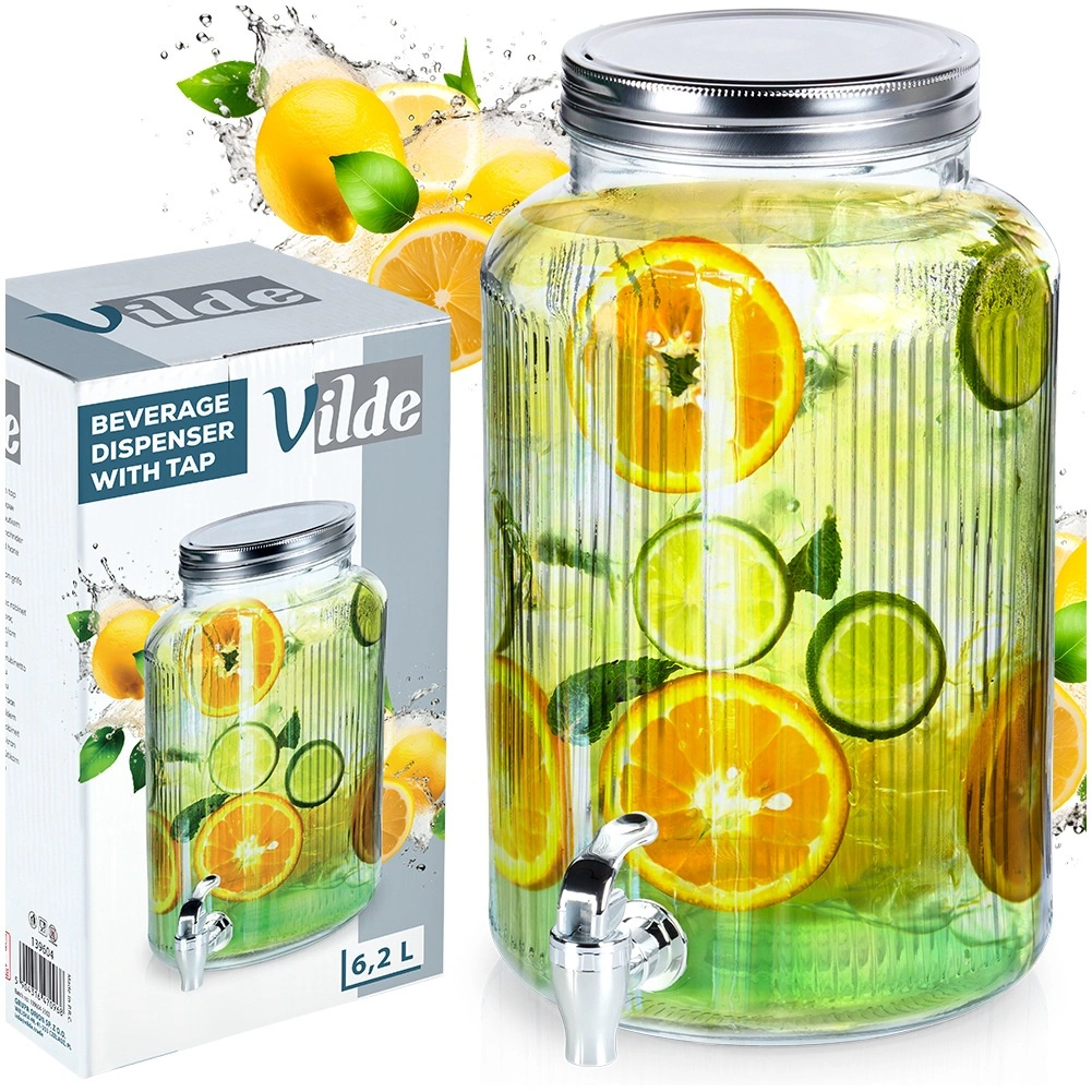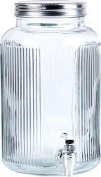 Elegants stikla dzērienu dozators ar ietilpību 6,2 l, praktisku krāniņu un skrūvējamu vāciņu apvieno stilu un funkcionalitāti limonādes, ūdens ar augļiem vai ledus tējas pasniegšanai. Izturīgs biezs stikls ar rievojumu ir drošs saskarei ar pārtiku un lieliski izskatās gan dārza ballītē, gan mājās.