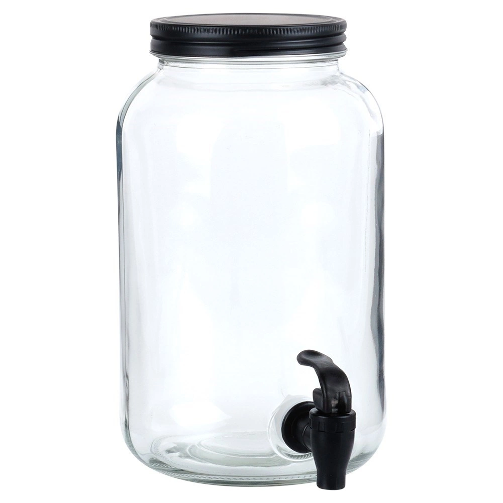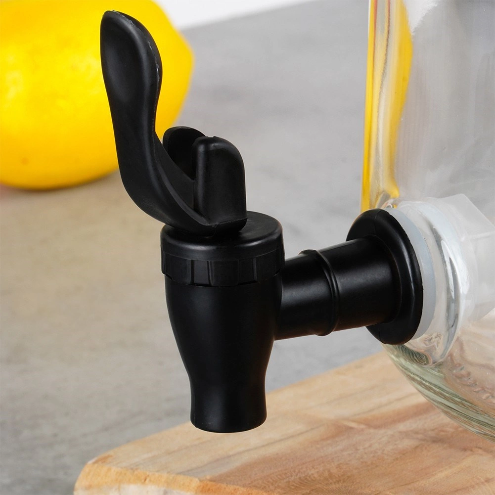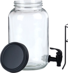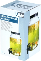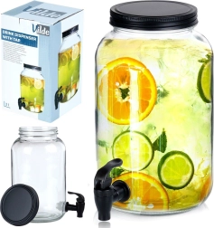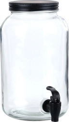 Stilīgs stikla dzērienu dozators ar tilpumu 3,2 l, aprīkots ar praktisku krāniņu un uzskrūvējamu vāciņu melnā krāsā. Ideāli piemērots limonādēm, augļu ūdenim, ledus tējai vai punšam. Pateicoties platajai atverei, to ir viegli pildīt un tīrīt, un stikla korpuss ir drošs saskarē ar pārtiku.