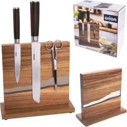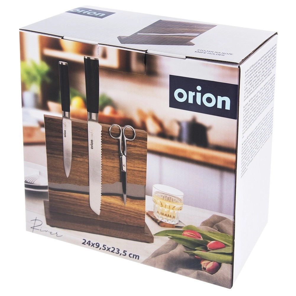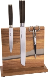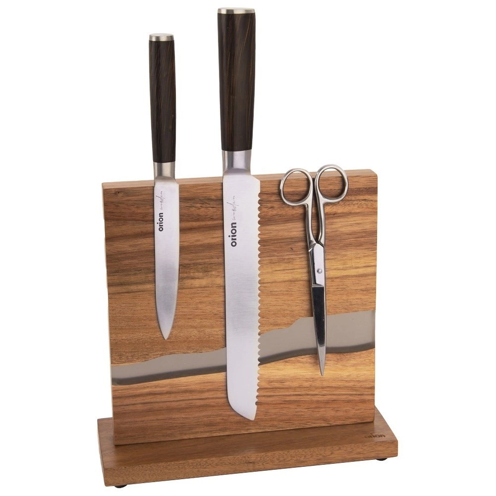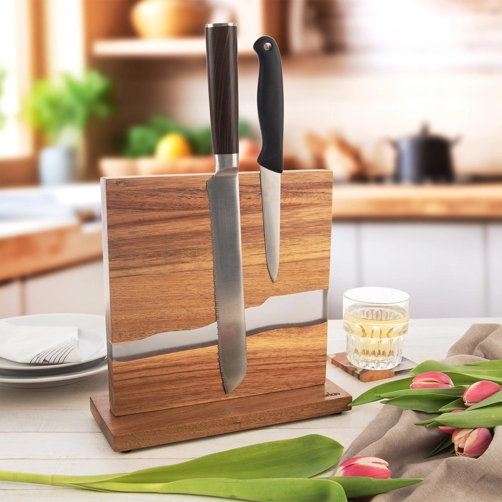 Elegants divpusējs nažu statīvs no dabīga akācijas koka ar dekoratīvu “upes” stila sveķu ieliktni piedāvā spēcīgu magnētisko virsmu, drošu un pārskatāmu glabāšanu nažiem un šķērēm, kā arī mūsdienīgu dizainu, kas der jebkurai virtuvei. Pateicoties divpusējai glabāšanai, tas ietaupa vietu uz virsmas, bet filca paliktņi pamatnē aizsargā darba virsmu no saskrāpēšanas.