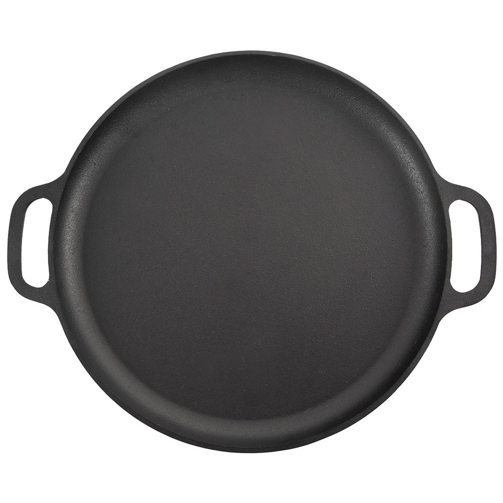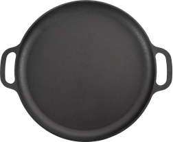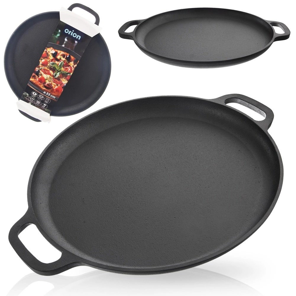 Izturīga čuguna panna ar 35 cm diametru un diviem rokturiem drošai pārnesei. Nodrošina vienmērīgu siltuma sadali, augstu karstumizturību un universālu izmantošanu uz plīts, grila un cepeškrāsnī. Ideāli piemērota cepšanai, cepināšanai un sautēšanai gaļai, dārzeņiem un kartupeļiem.