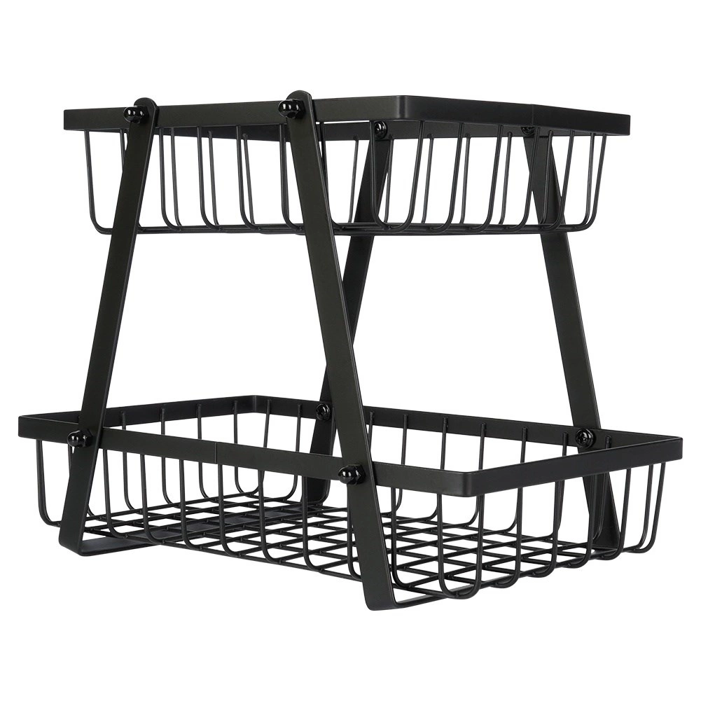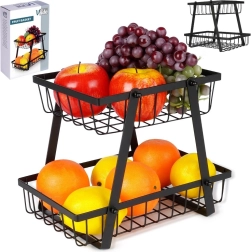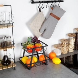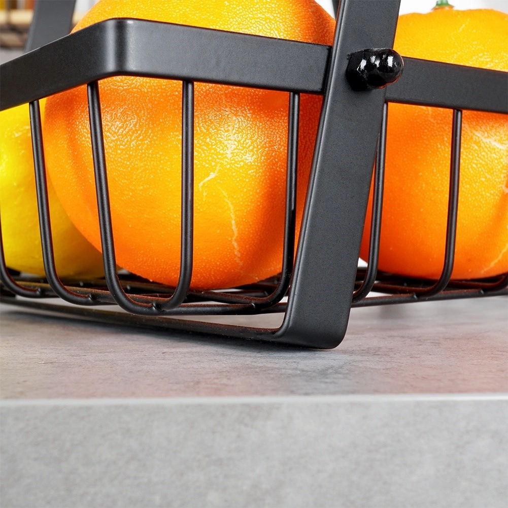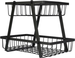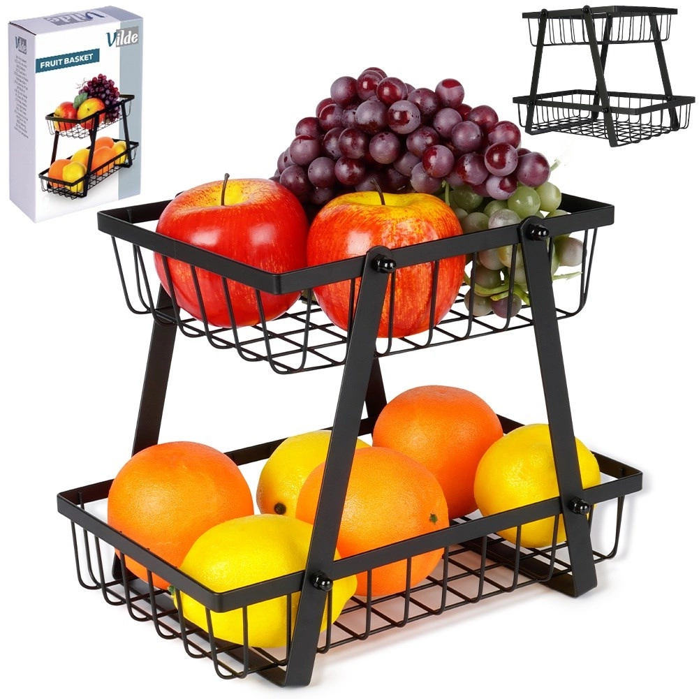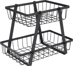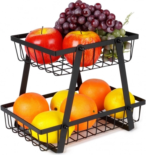 Stilīgs un praktisks palīgs jebkurai virtuvei: divlīmeņu statīvs ar stiepļu groziem industriālā loft stilā ietaupa vietu un vienlaikus skaisti izceļ jūsu augļus un dārzeņus. Atvērtās sienas veicina gaisa cirkulāciju, tādēļ produkti ilgāk saglabājas svaigi un labi redzami.