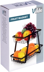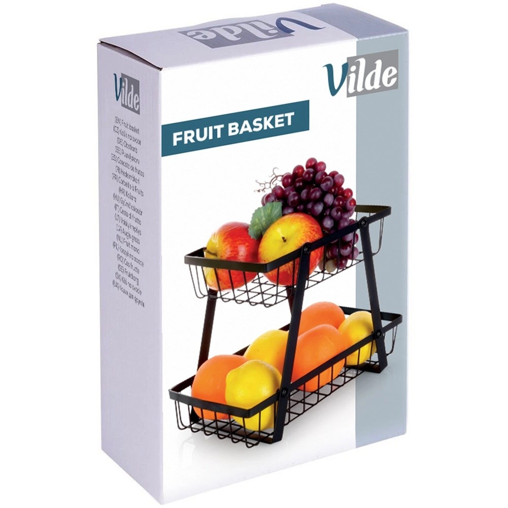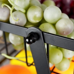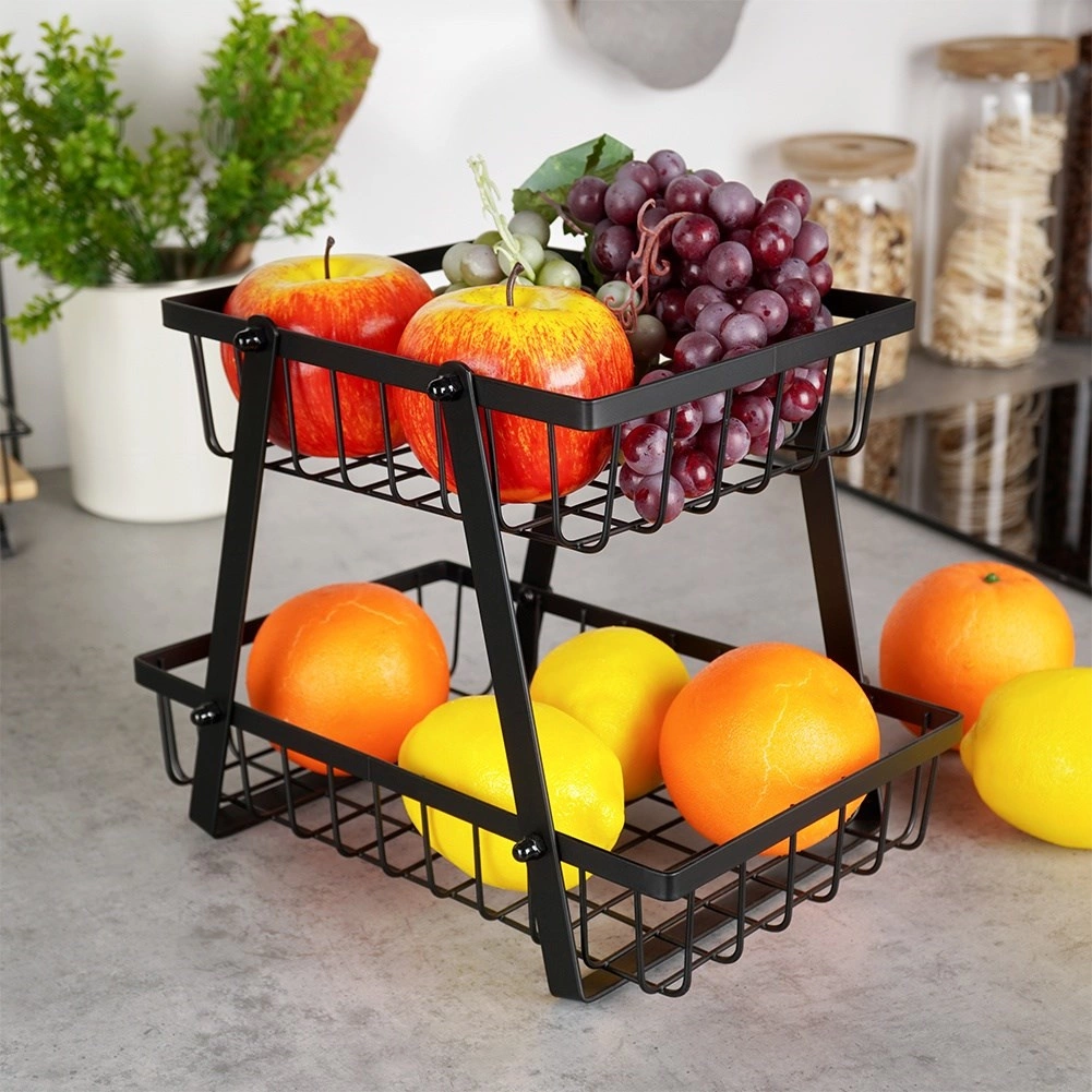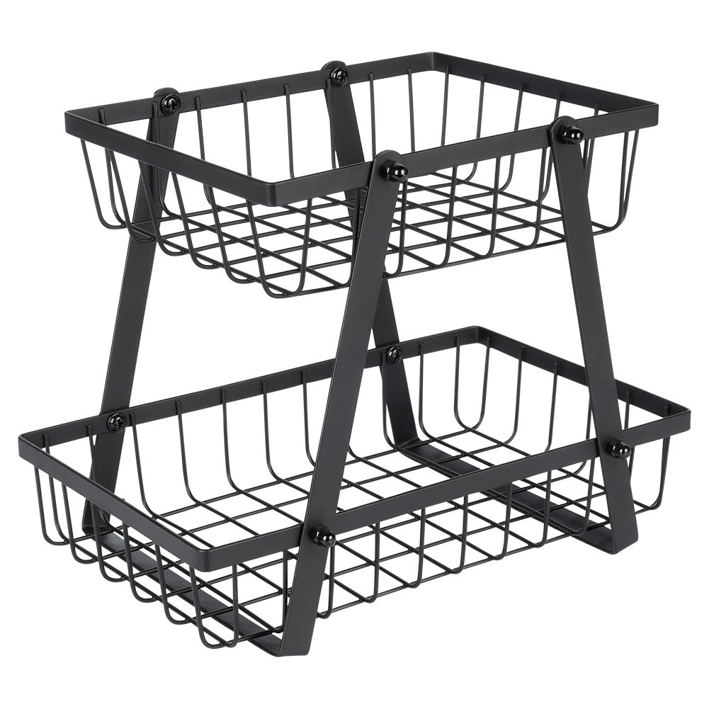 Stilīgs un praktisks palīgs jebkurai virtuvei: divlīmeņu statīvs ar stiepļu groziem industriālā loft stilā ietaupa vietu un vienlaikus skaisti izceļ jūsu augļus un dārzeņus. Atvērtās sienas veicina gaisa cirkulāciju, tādēļ produkti ilgāk saglabājas svaigi un labi redzami.
