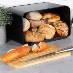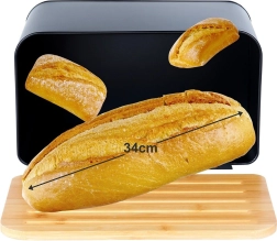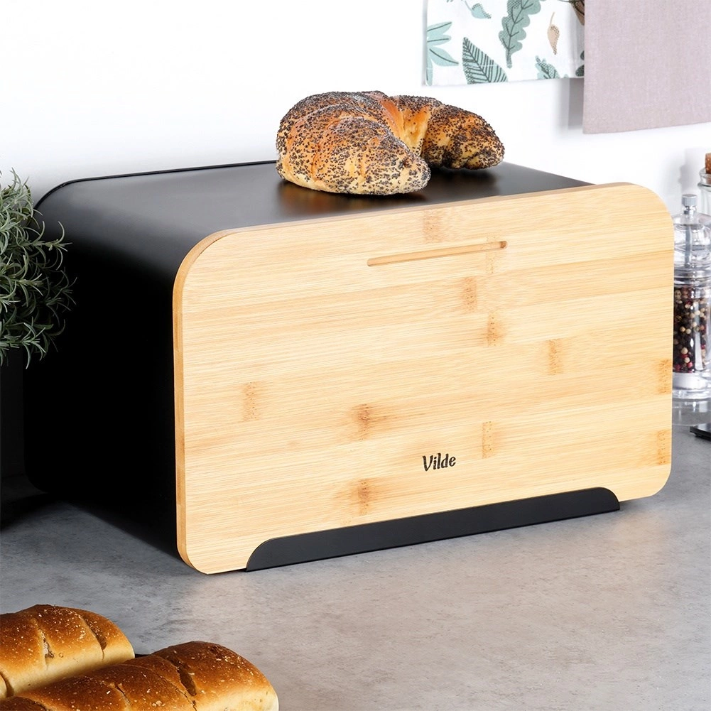 Mūsdienīga maizes kaste, kurā apvienots matēts melns metāls un dabīgs bambuss, efektīvi ierobežo gaisa piekļuvi, lai maiznīcas izstrādājumi ilgāk paliktu mīksti un gardi. Masīvais metāla korpuss ir izturīgs un pasargā no mehāniskiem bojājumiem, kamēr dabīgais vāks virtuvei piešķir siltumu un eleganci.