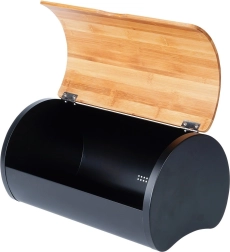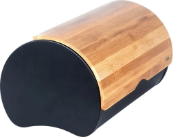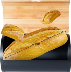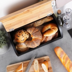 Eleganta maizes kaste no melna tērauda ar dabīga bambusa vāku uztur maizi un konditorejas izstrādājumus ilgāk svaigus, pasargā tos no gaisa un putekļiem un vienlaikus stilīgi papildina jebkuru virtuvi. Izturīgā konstrukcija nodrošina noturību, ietilpīgais korpuss paredzēts dažādiem maizes izstrādājumiem, bet praktiskais vāks ļauj ātri un ērti atvērt.