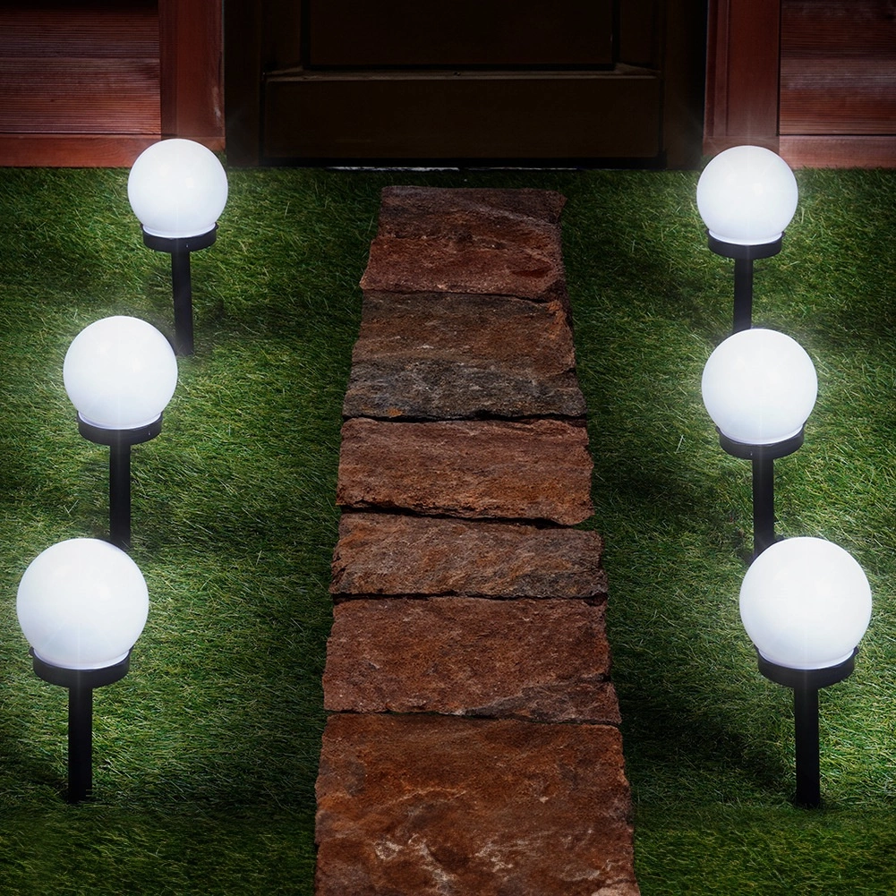 Sešu apaļu lampu komplekts vienmērīgi izgaismo celiņus un dārza zonas. IP44 aizsardzība āra lietošanai.