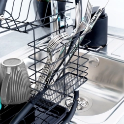 Augšējais līmenis ietilpina līdz 14 šķīvjiem, apakšējais – līdz 11 šķīvjiem vai citiem traukiem. Komplektā ir noņemams piederumu grozs, speciāls turētājs griešanas dēlim un praktiski rokturi ērtai pārvietošanai. Izņemamā noteces paplāte atvieglo kopšanu un uztur darba virsmu sausu.