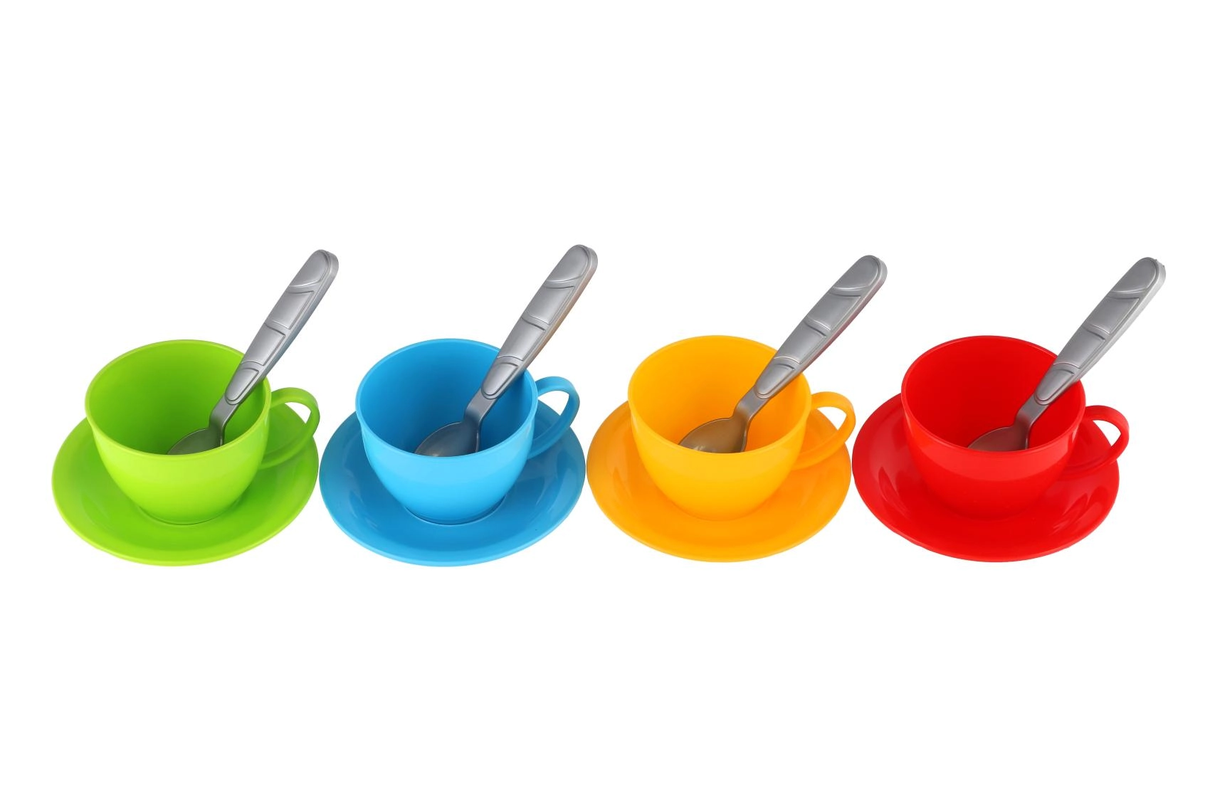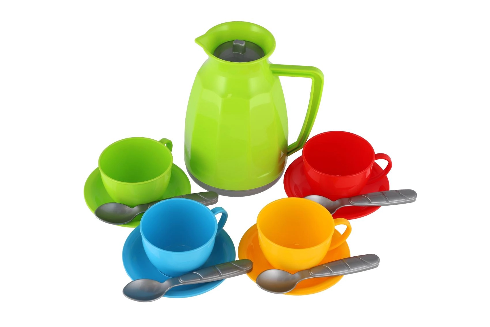 - Tējkanna, 4 tasītes, 4 apakštasītes, 4 karotītes (krāsu kombinācija)