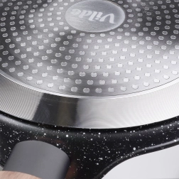 Daudzslāņu dibens ar indukcijas plāksni izplata siltumu pa visu pannas virsmu, ietaupot laiku un enerģiju un nodrošinot vienmērīgu izcepšanos.