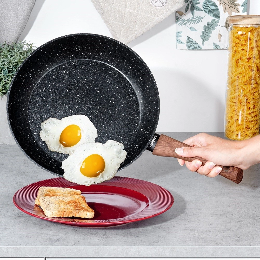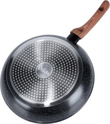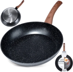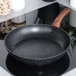 Stilīga granīta panna ar 28 cm diametru ikdienas gatavošanai. Pateicoties nelīpošajai akmens virsmai, ātrai un vienmērīgai siltuma izkliedei un ergonomiskam rokturim ar koka imitāciju, varat gatavot veselīgi ar minimālu tauku daudzumu uz visiem plīts veidiem, tostarp indukcijas.