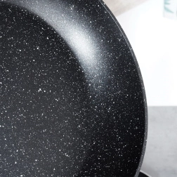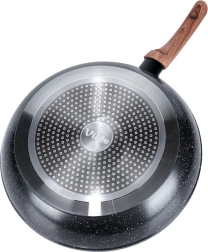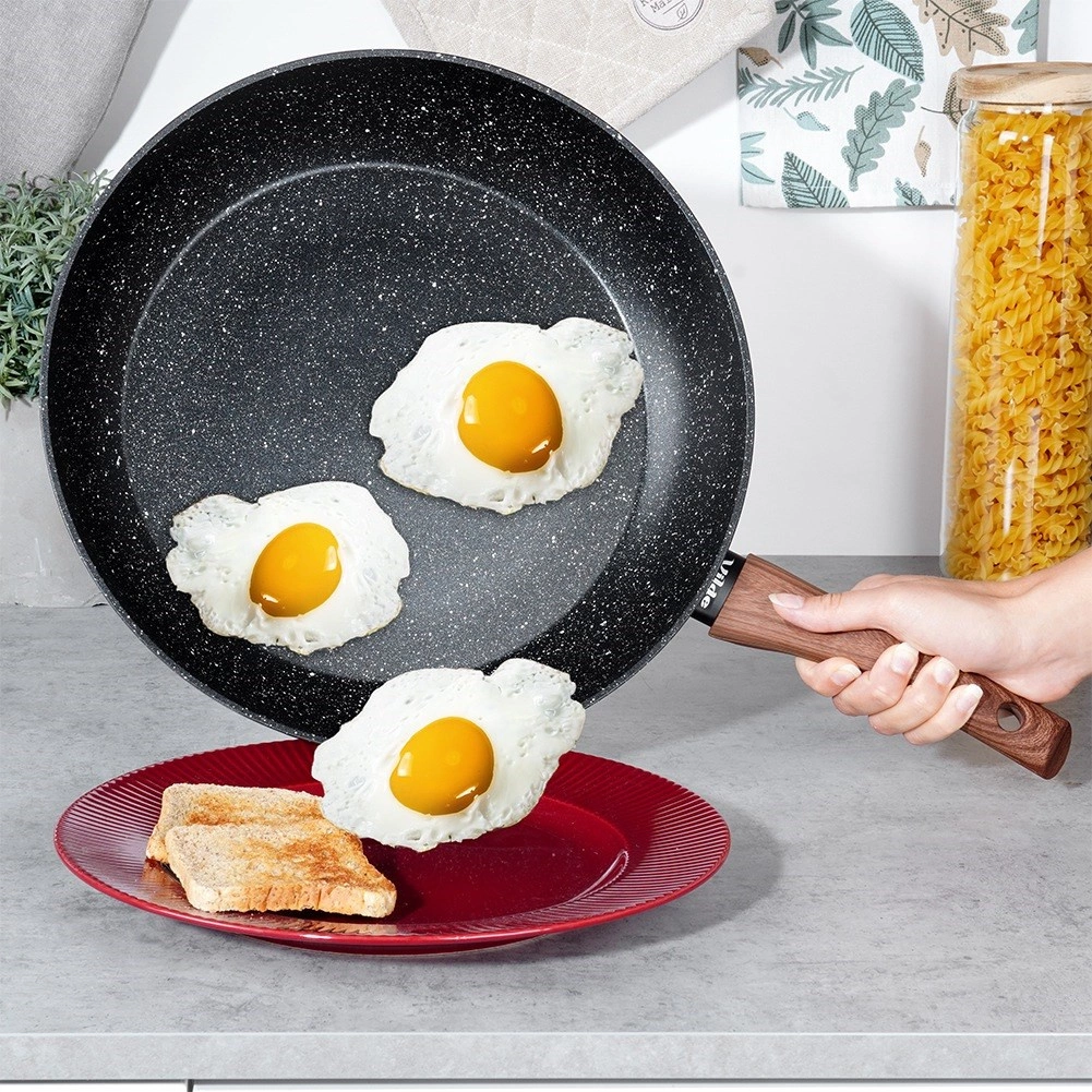 Liela 32 cm diametra granīta panna ar nepielīpošu pārklājumu, ātru un vienmērīgu siltuma sadali un ergonomisku rokturi ar koka izskatu. Piemērota visu veidu plītīm, tostarp indukcijai, un trauku mazgājamajai mašīnai – ideāla ikdienas cepšanai un sautēšanai ar minimālu tauku daudzumu.
