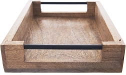 Elegantā servēšanas paplāte no mango koka apvieno dabisku izskatu ar industriālo loft stilu. Pateicoties augstām malām un stipriem metāla rokturiem melnā krāsā, krūzīšu, tējkannu, glāžu un šķīvju pārnēsāšana ir ērta un droša. Koka dabiskā faktūra piešķirs jūsu klājumam izteiksmīgu raksturu.