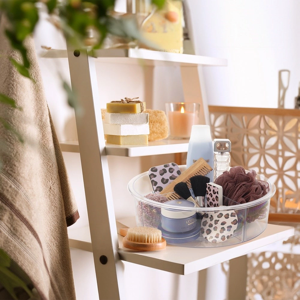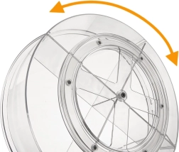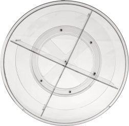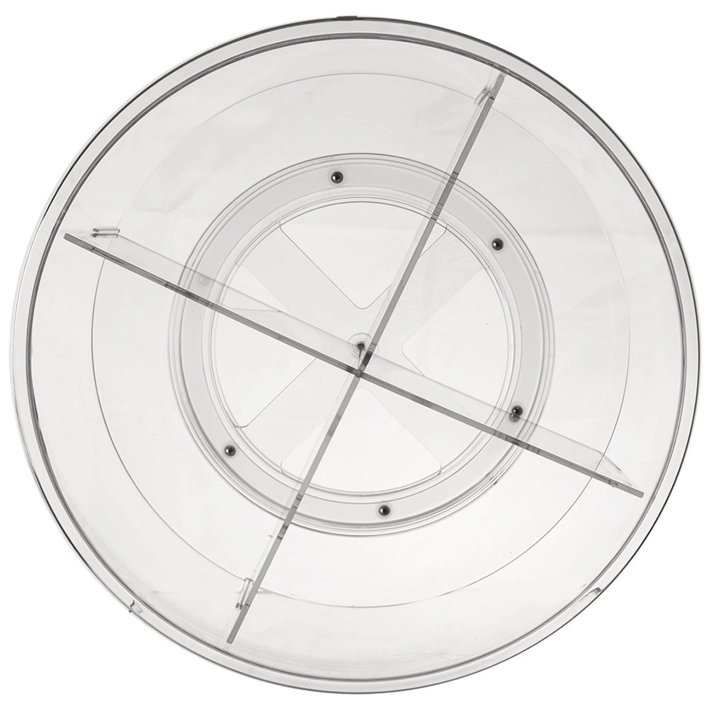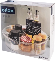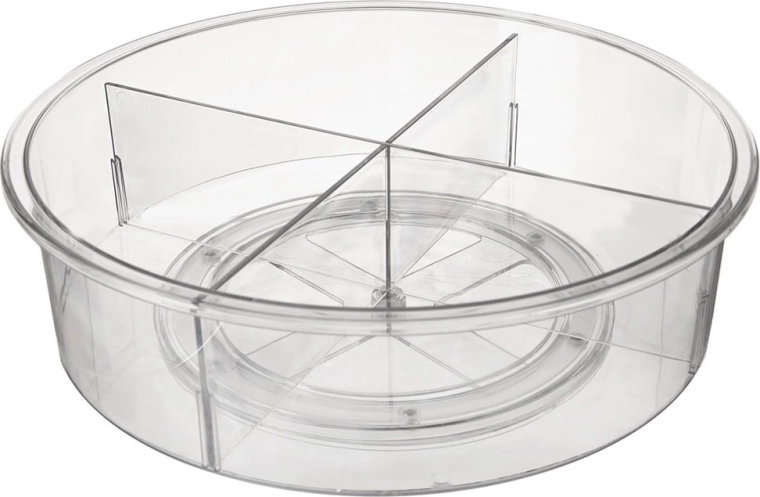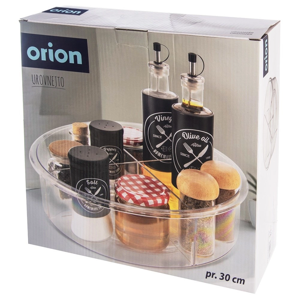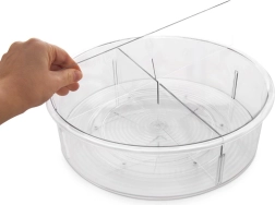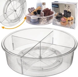Praktisks rotējošs organizators ar 30 cm diametru un 9 cm augstumu ievieš kārtību virtuvē, vannasistabā un pieliekamajā. Pateicoties pamatnei ar vienmērīgu gaitu, tas griežas par 360°, tāpēc viss ir ātri pa rokai. Caurspīdīgais izpildījums un 4 atdalītas sekcijas atvieglo pārskatāmu garšvielu, kosmētikas, pudeļu un burku kārtošanu, savukārt paaugstinātās malas novērš priekšmetu izkrišanu griešanās laikā.