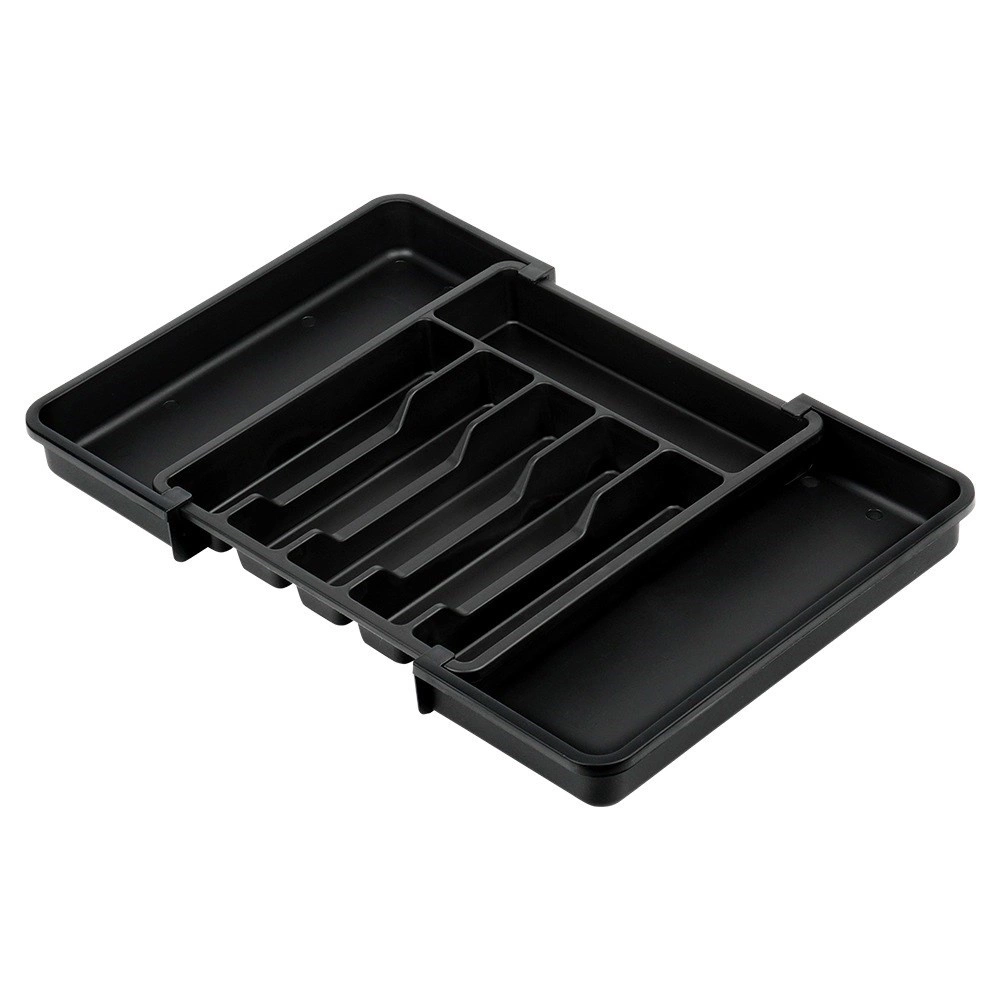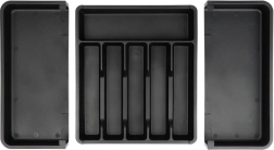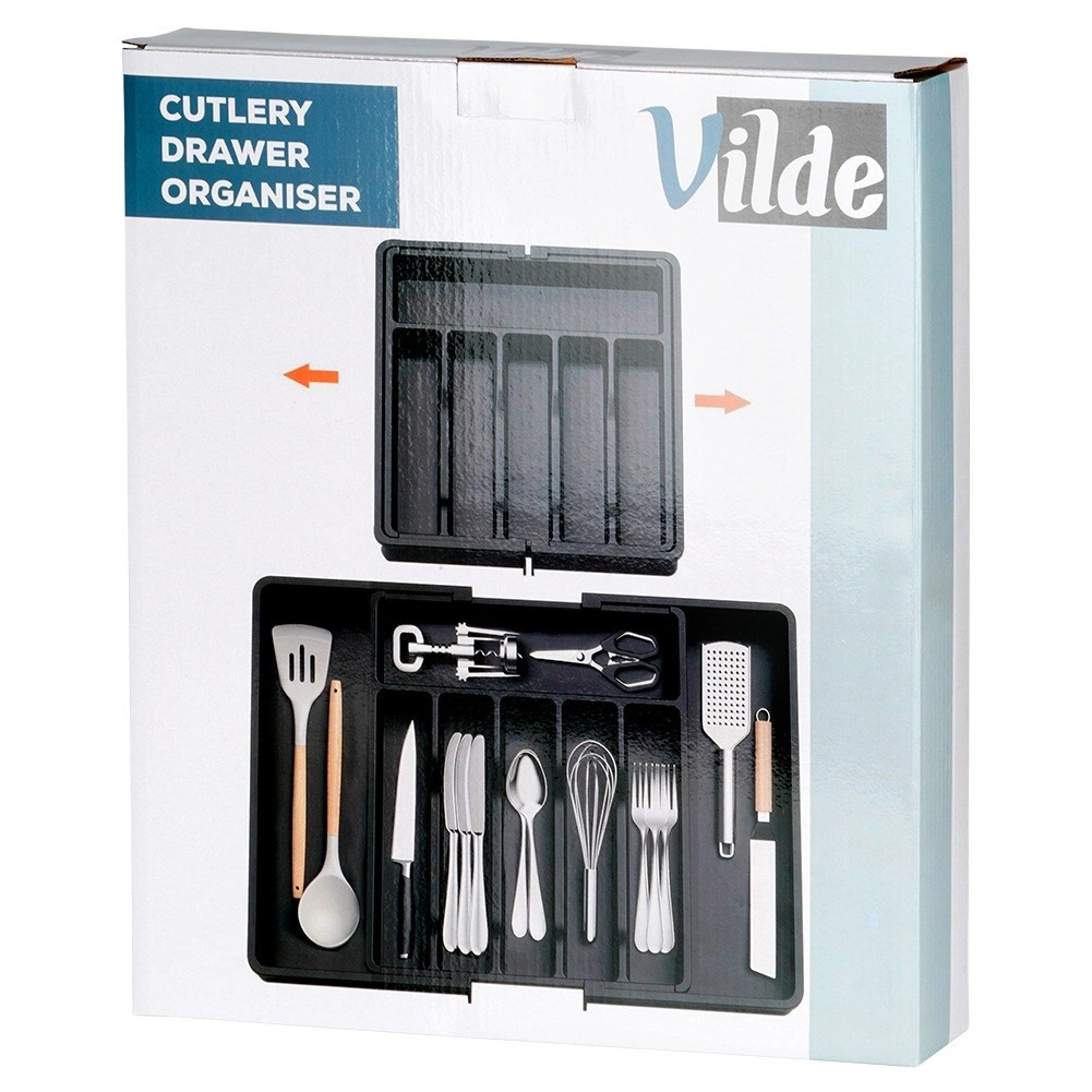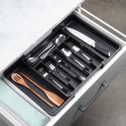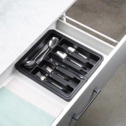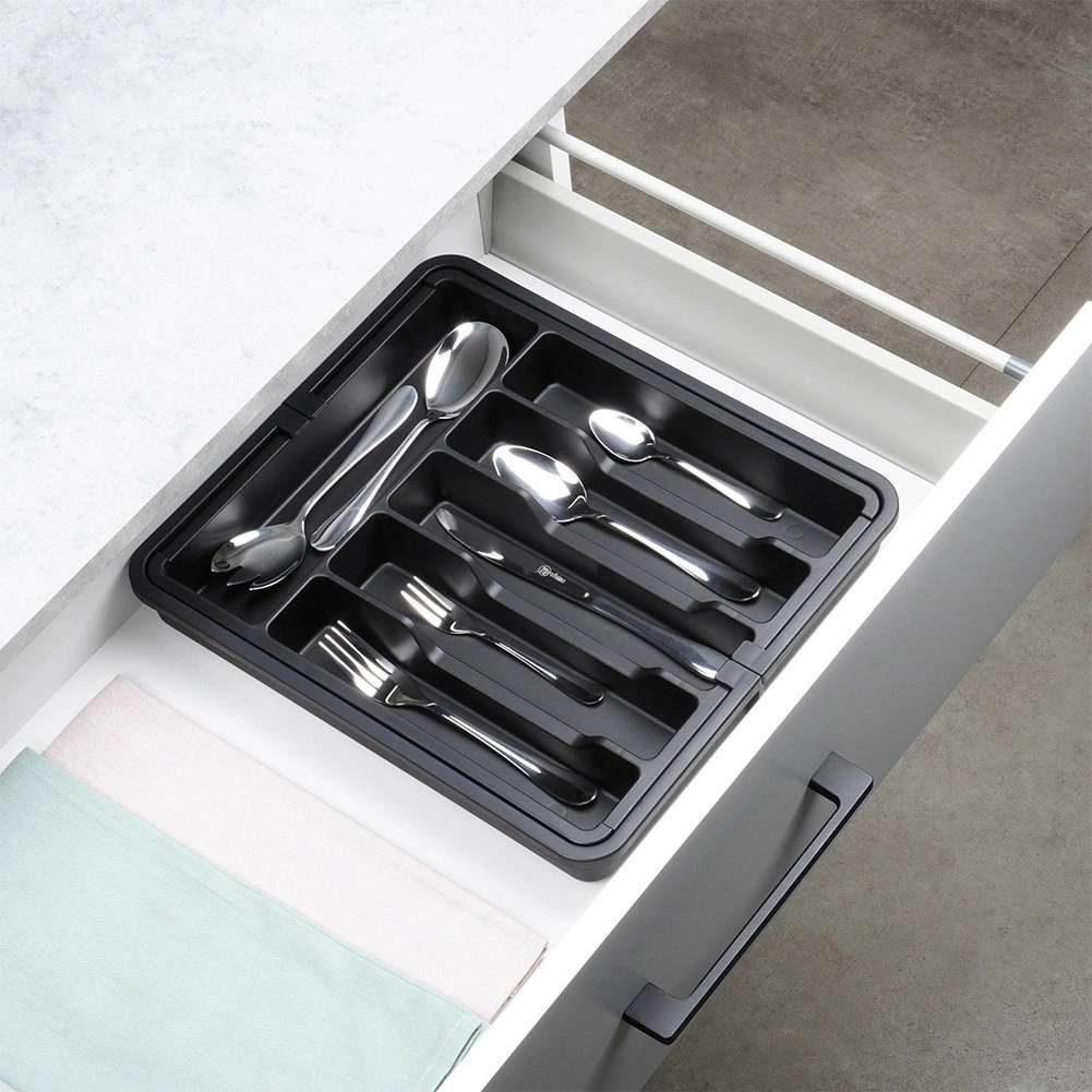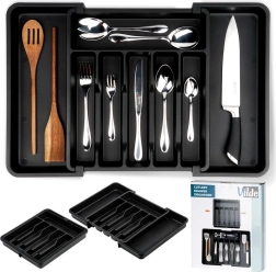 Praktisks izvelkams atvilktnes organizētājs uzturēs jūsu galda piederumus un virtuves piederumus vienmēr pārskatāmi savā vietā. Pateicoties platumam, ko var regulēt no 33 līdz 56,5 cm, tas viegli pielāgojas lielākajai daļai atvilktņu, tam ir daudzas nodalījumu sekcijas nažiem, dakšām, karotēm un lāpstiņām, un tas ir izgatavots no izturīgas plastmasas elegantā melnā krāsā ilgam kalpošanas laikam un ērtai tīrīšanai.