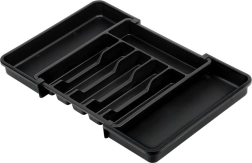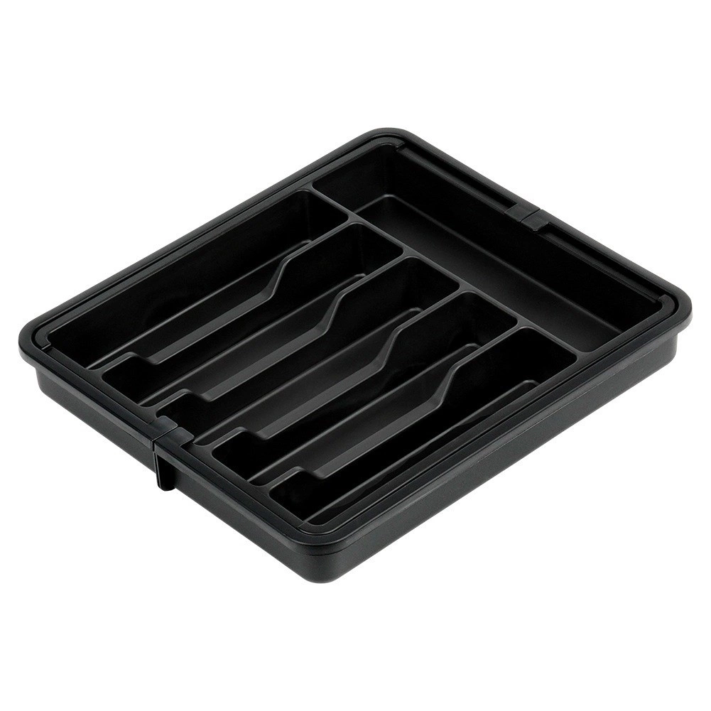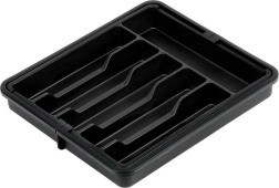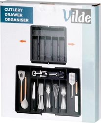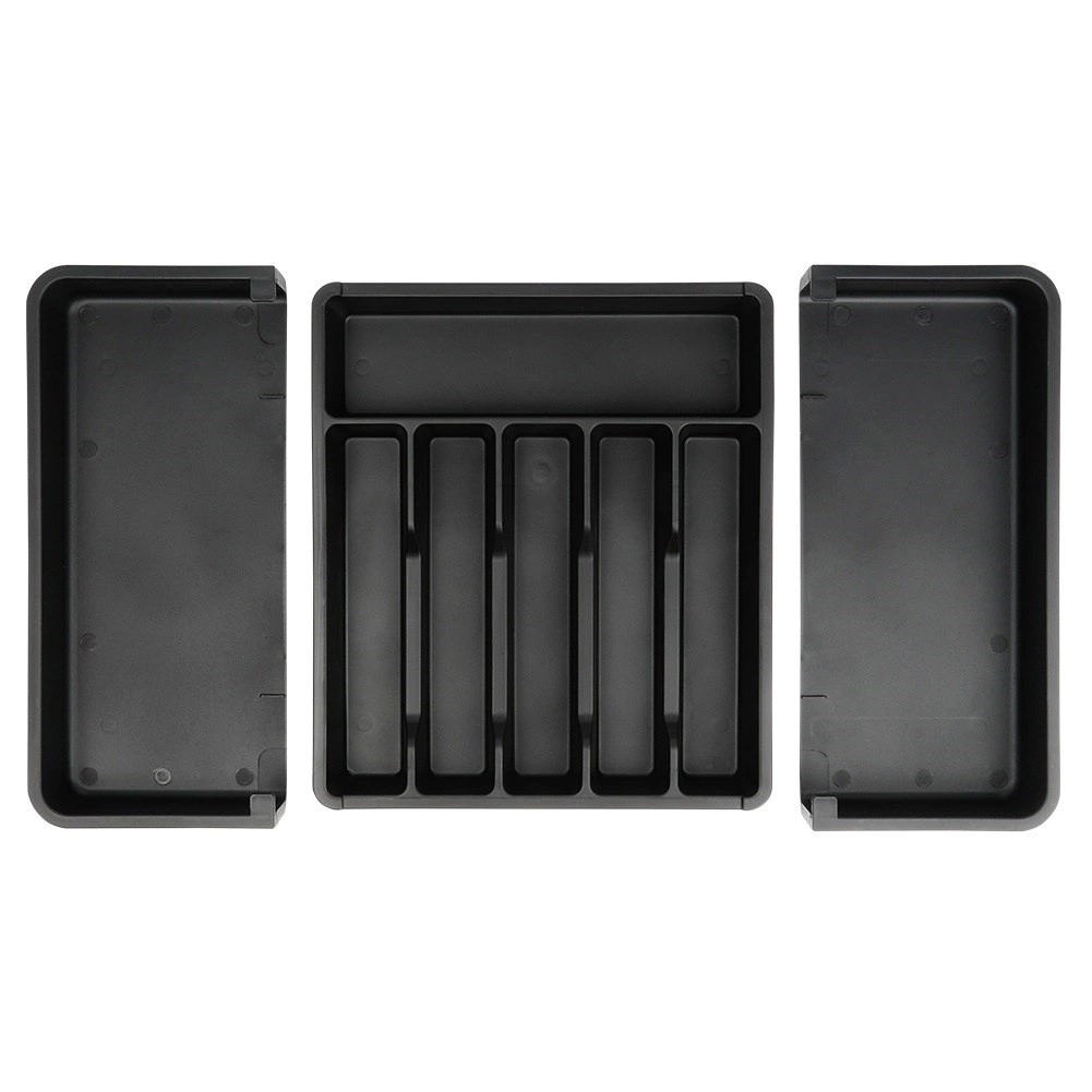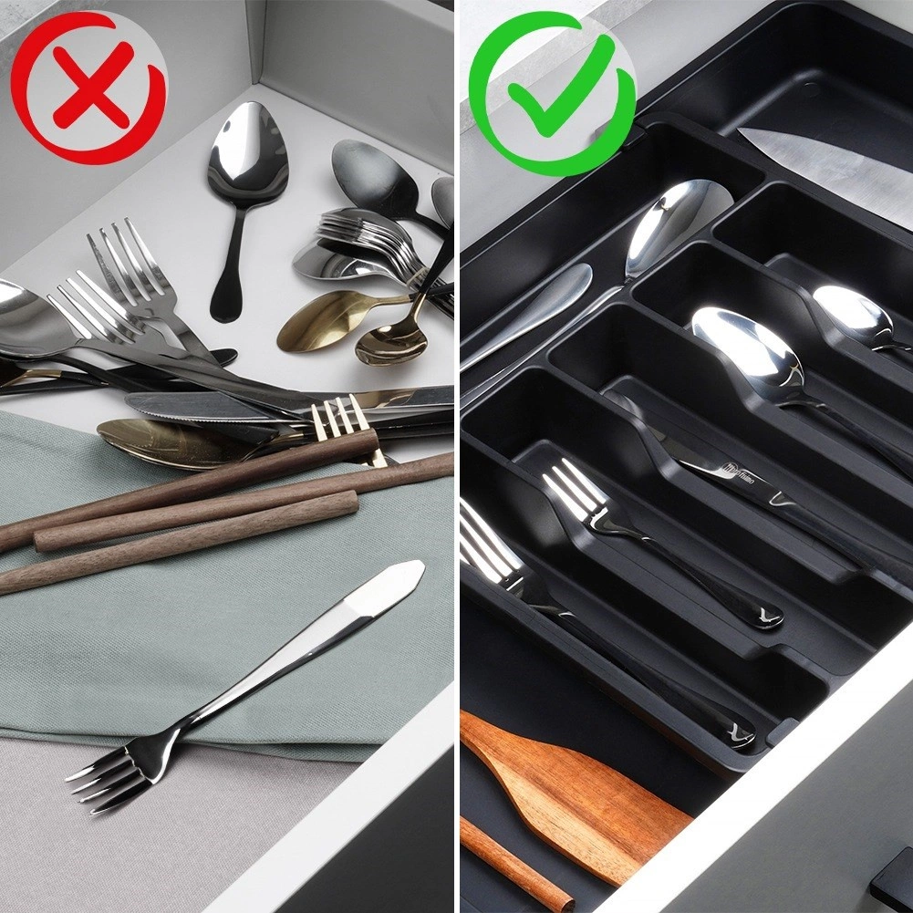 Praktisks izvelkams atvilktnes organizētājs uzturēs jūsu galda piederumus un virtuves piederumus vienmēr pārskatāmi savā vietā. Pateicoties platumam, ko var regulēt no 33 līdz 56,5 cm, tas viegli pielāgojas lielākajai daļai atvilktņu, tam ir daudzas nodalījumu sekcijas nažiem, dakšām, karotēm un lāpstiņām, un tas ir izgatavots no izturīgas plastmasas elegantā melnā krāsā ilgam kalpošanas laikam un ērtai tīrīšanai.