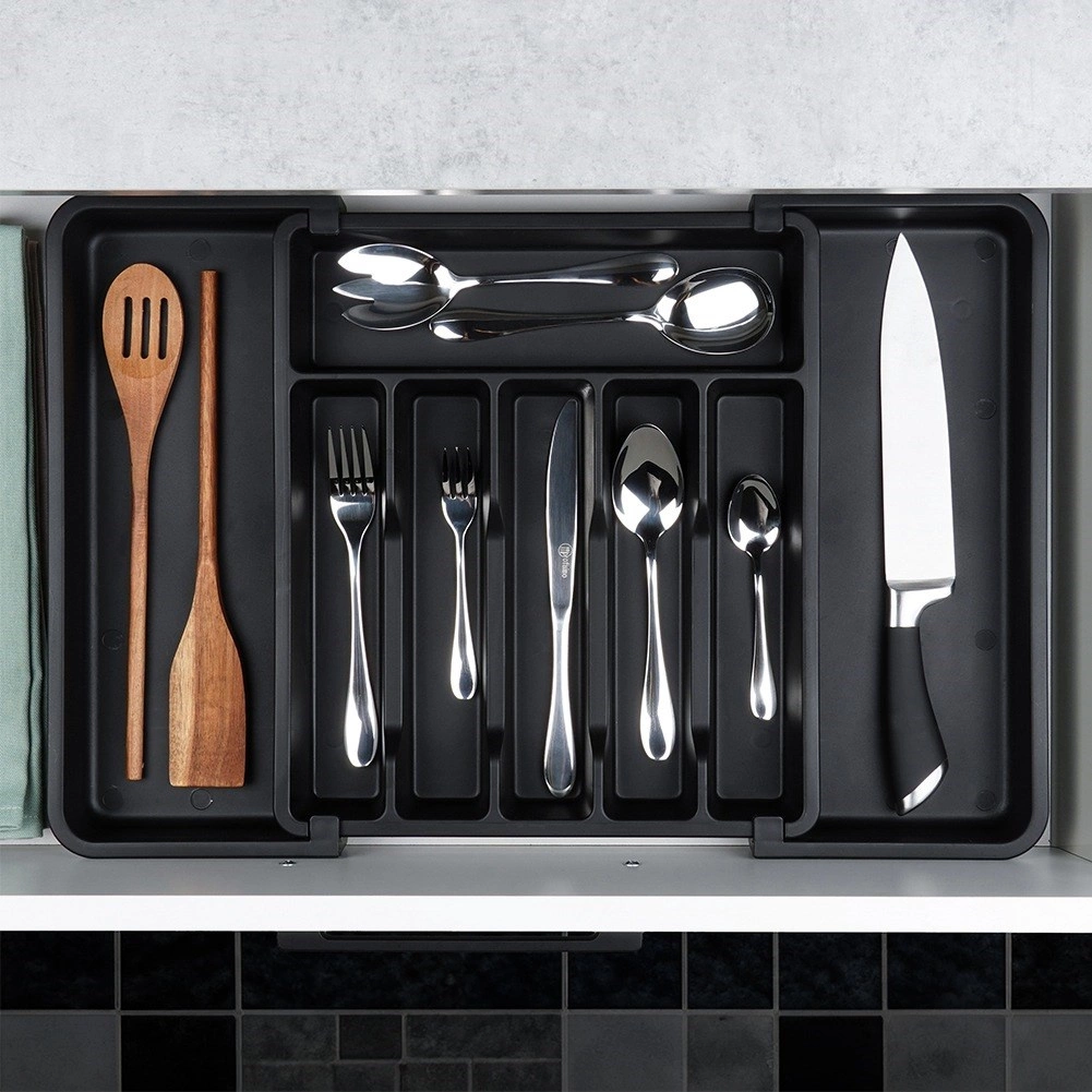 Sakārtojiet savu virtuvi uz ilgstošu kārtību. Izvelkamā konstrukcija ļauj vienmērīgi paplašināt līdz 56,5 cm, tāpēc organizētājs precīzi der dažāda platuma atvilktnēm. Segmentētie nodalījumi nodrošina drošu un higiēnisku galda piederumu, nažu un virtuves piederumu glabāšanu, lai tie vienmēr būtu ātri pie rokas.