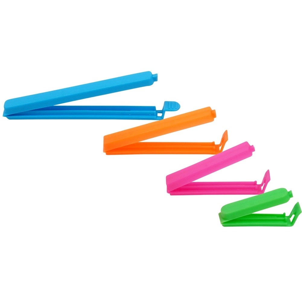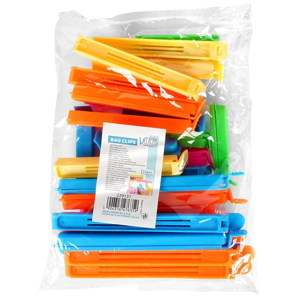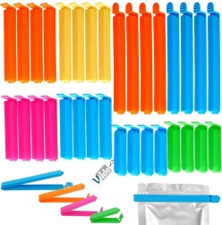 Praktisks 32 atkārtoti lietojamu klipšu komplekts 4 izmēros hermētiskai maisiņu aizspiešanai ar pārtiku. Izturīgi plastmasas klipši piecu krāsu miksā saglabā svaigumu un novērš mitrumu, izbēršanos un satura bojāšanos. Vienkārša lietošana ar vienu kustību, ideāli virtuvei, pieliekamajam un saldētavai.