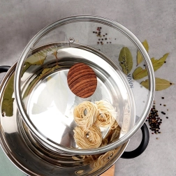 Robustā nerūsējošā tērauda apmale nodrošina ilgu kalpošanas laiku un ciešu piegulšanu trauka malai. Ergonomiskā poga ar koka imitāciju ir patīkama pieskārienam un droša lietošanā. Integrētā ventilācijas atvere uzticami izvada lieko tvaiku, bet viegli izliektā forma veicina karstā gaisa cirkulāciju.