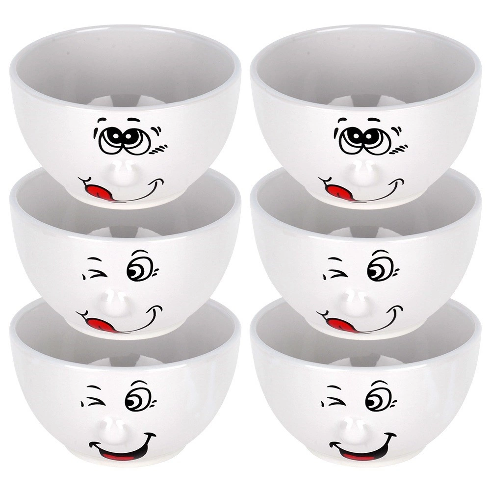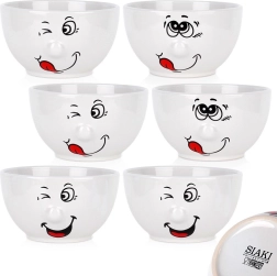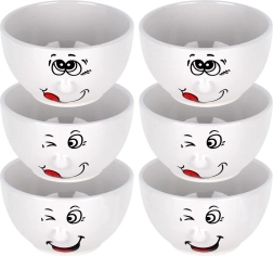 Ieprieciniet galdu ar šo 6 baltu keramikas bļodu komplektu ar tilpumu 550 ml un diametru 13,5 cm. Katrai bļodai ir rotaļīgs smaidīgas sejas motīvs, tā ir piemērota trauku mazgājamajai mašīnai un mikroviļņu krāsnij un lieliski noder zupām, pārslām, jogurtam un uzkodām. Izturīga keramika un klasiska forma nodrošina ilgu kalpošanas laiku un skaistu izskatu ikvienā situācijā.