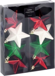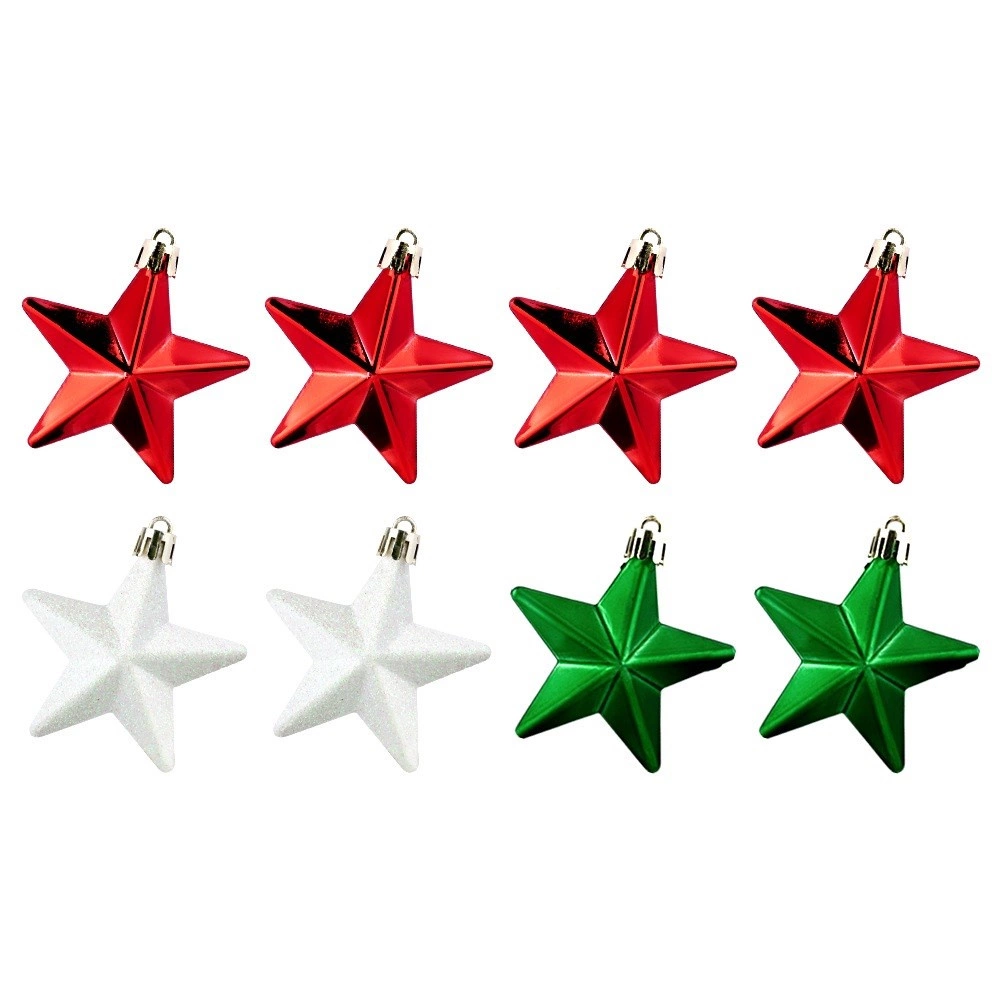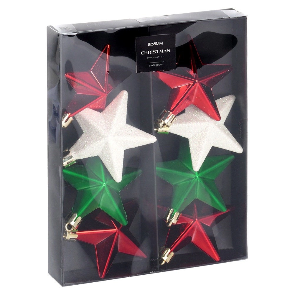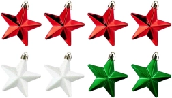 Stilīgs komplekts ar 8 nesalaužamām Ziemassvētku rotām zvaigznes formā krāsās sarkana, zaļa un balta ar spīdīgu, matētu un mirdzošu pārklājumu. Zvaigznītes ar diametru 6,5 cm piešķir jūsu dekoram klasisku mirdzumu un drošu eleganci – ideāli mājokļiem ar bērniem un mājdzīvniekiem.