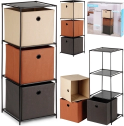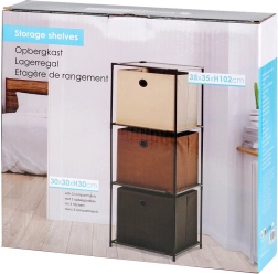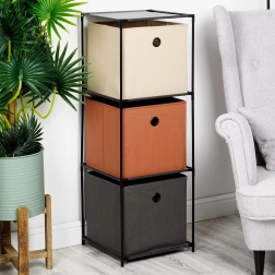 Šis šaurais plaukts ar izmēriem 34,5 × 34,5 × 100 cm apvieno izturīgu melnu metāla rāmi un trīs tekstila kastes bēšā, brūnā un antracīta krāsā. Katrai kastei ir metāla acs vieglai pārnēsāšanai, un tā ir salokāma, lai nelietojot neaizņemtu vietu. Ideāls risinājums pārskatāmai kārtošanai un uzglabāšanai.