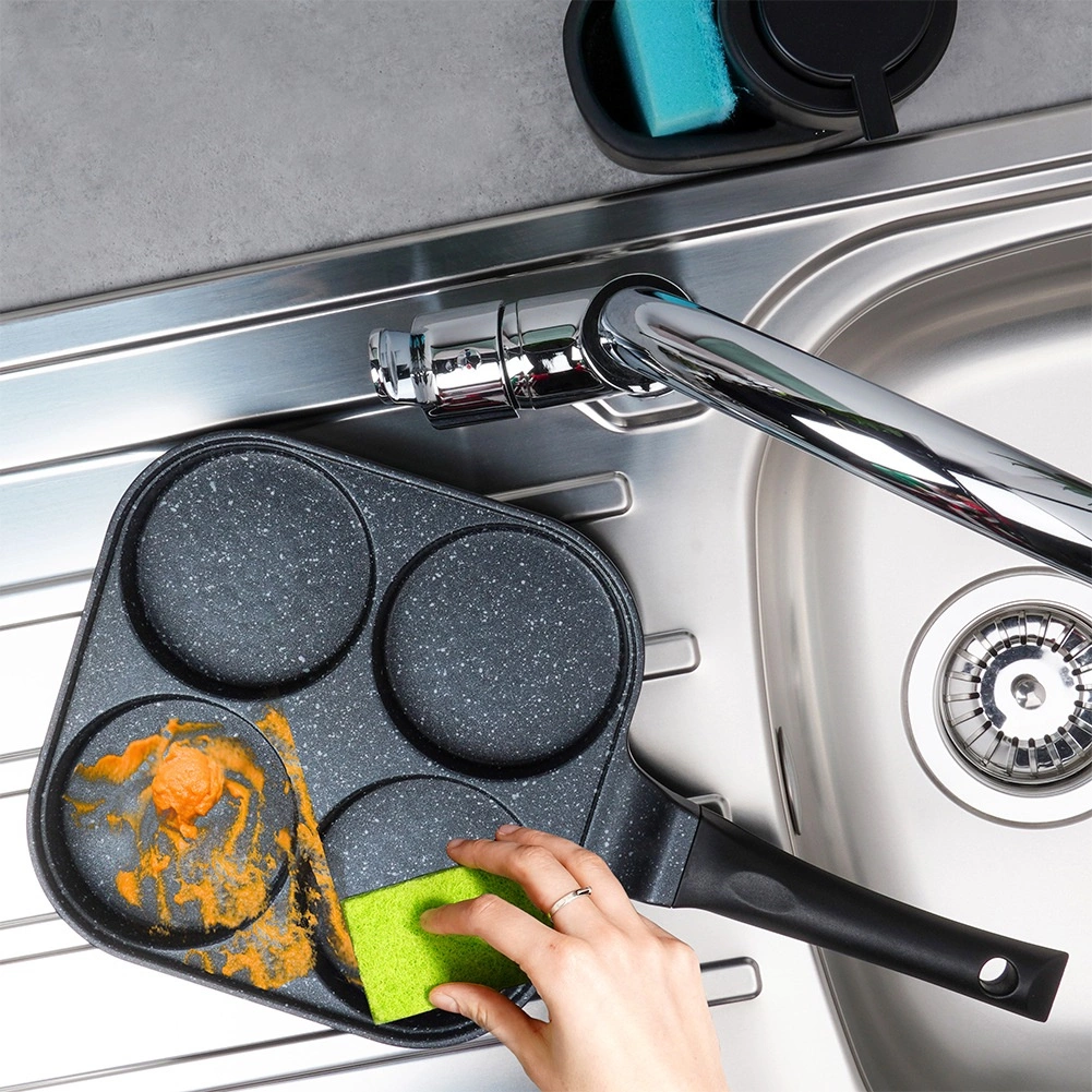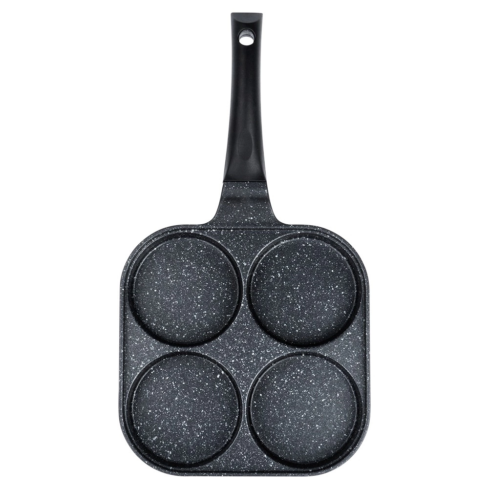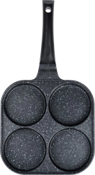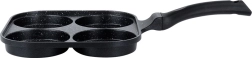 Kvadrātveida panna 22 × 22 cm ar četrām atsevišķām kamerām nodrošina vienādu porciju izmēru un perfektu brokastu izskatu. Alumīnija korpuss ar granitīta nelīpošo kārtu ātri uzsilst un lieliski vada siltumu, tāpēc cepšana ir ātra, ekonomiska un bez piedegšanas. Ergonomisks, pret-slīdes rokturis ar piekares atveri nodrošina ērtu un drošu lietošanu.