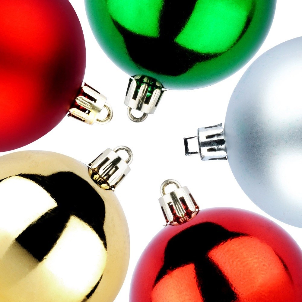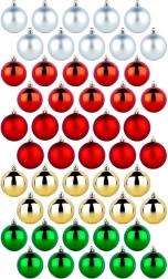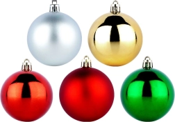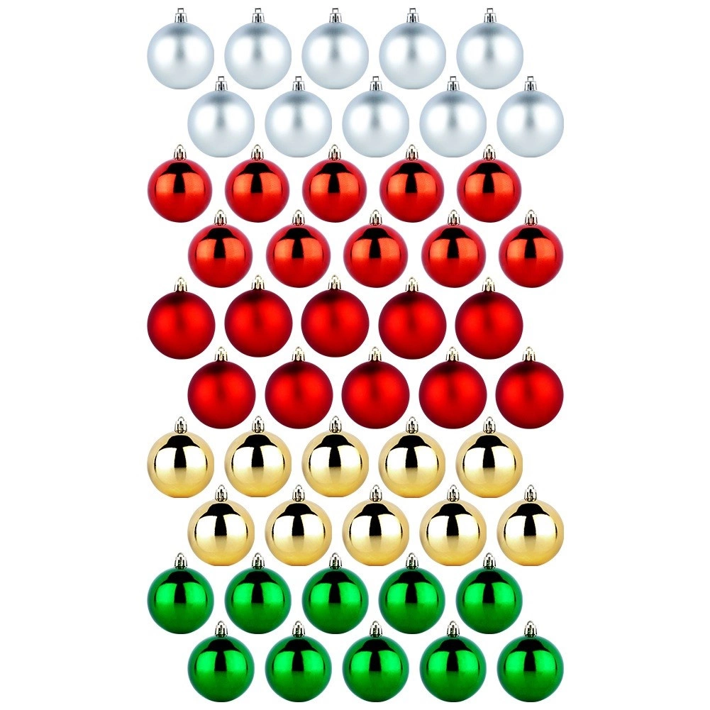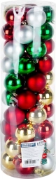 Stilīgs komplekts ar 50 Ziemassvētku rotājumiem 6 cm diametrā sarkanā, zaļā, zeltainā un sudrabainā krāsā. Apvieno spīdīgas un matētas virsmas, ir neplīstošs un drošs bērniem un mājdzīvniekiem. Komplektā ir aukliņas piekāršanai – ideāli Ziemassvētku eglei, vainagiem un girlandēm.