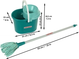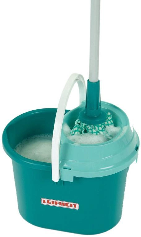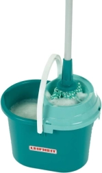 Reālistisks komplekts mazajiem mājas palīgiem: bērnu spainis ar uzliekamu izspiedēju un svītraino mopu ar LEIFHEIT licenci no zīmola KLEIN. Piemērots pieaugušo darbību atdarināšanai, izgatavots no izturīgiem materiāliem un izmantojams arī ar ūdeni vēl autentiskākai spēlei.