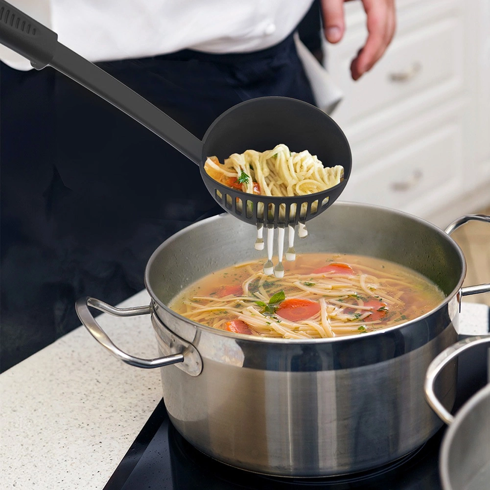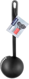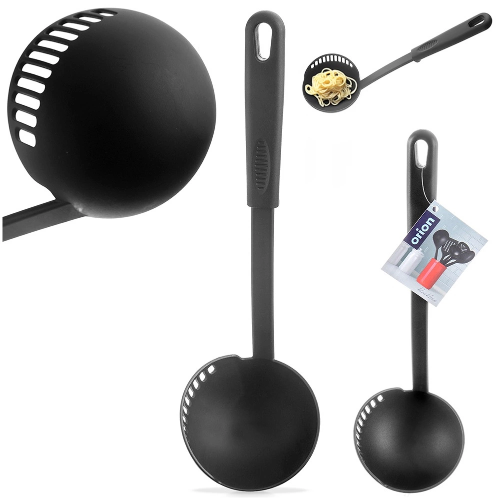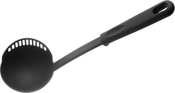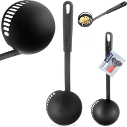 Praktiska virtuves karote ar integrētu sietiņmalu, 150 ml tilpums un 30,5 cm garums – ideāli zupām, mērcēm un gulašiem. Izgatavota no viegla, izturīga termoplasta elegantā melnā krāsā, saudzīga pret nepiedegošu trauku pārklājumu un izturīga pret temperatūru līdz 200 °C. Karote no sērijas BLACKLINE piedāvā vieglu notecināšanu, ērtu servēšanu un iespēju piekārt ātrai uzglabāšanai. Piemērota trauku mazgājamajai mašīnai.