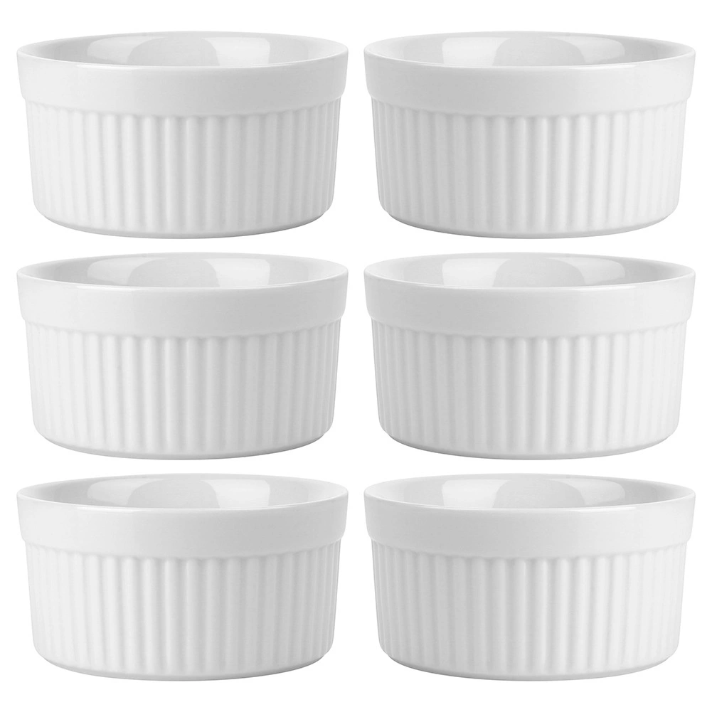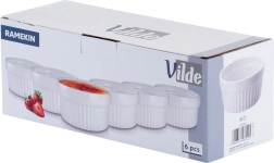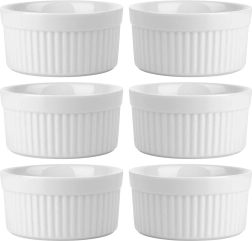 Praktisks sešu balto cepamo bļodiņu komplekts ar 260 ml tilpumu piedāvā elegantus risinājumus gan cepšanai, gan pasniegšanai. Kvalitatīvās keramikas bļodiņas ir karstumizturīgas līdz 350 °C, piemērotas krāsnij, mikroviļņu krāsnij un trauku mazgājamajai mašīnai. Pateicoties klasiskajam rievotajam dizainam un gludajai glazūrai, tās ir lieliski piemērotas crème brûlée, suflē, mazām zapekuma porcijām, mērcēm vai uzkodām.