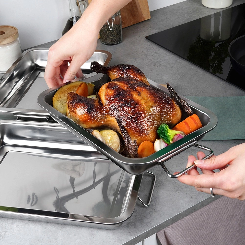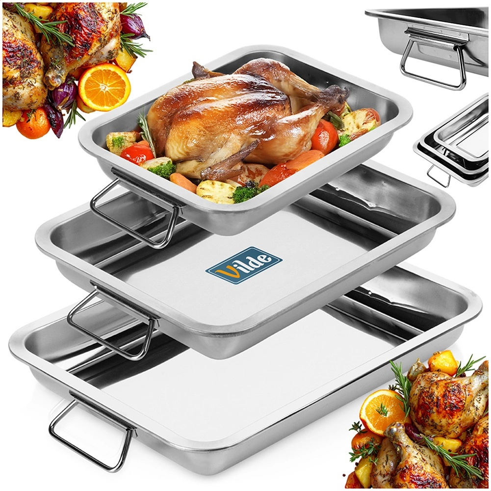 Praktisks trīs taisnstūrveida cepamtrauku komplekts no kvalitatīva nerūsējošā tērauda gaļas, dārzeņu un desertu cepšanai. Pateicoties dažādiem izmēriem un salokāmiem rokturiem, ēdienus viegli sagatavot un pārnest no krāsns uz galdu. Glāns un gluds virsmas pārklājums nodrošina ērtu tīrīšanu, izturīga konstrukcija ir paredzēta ikdienas lietošanai, bet iespēja mazgāt trauku mazgājamajā mašīnā ietaupa laiku.