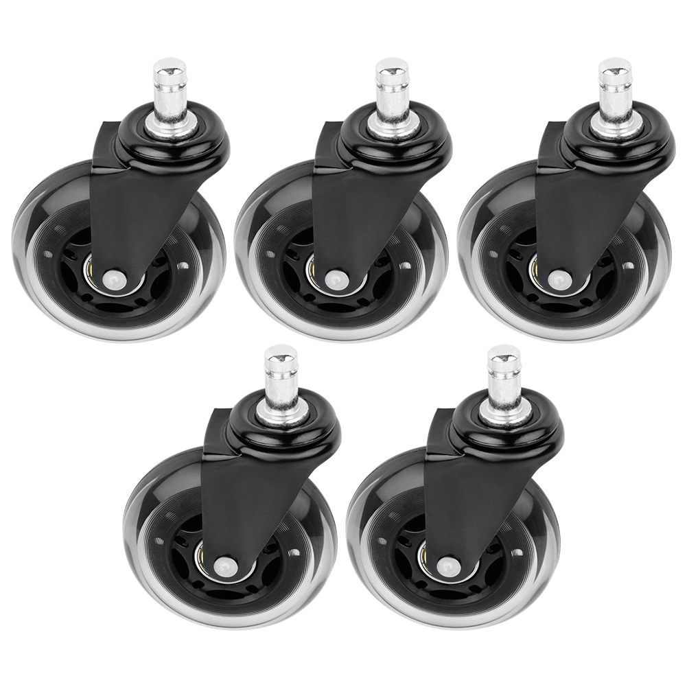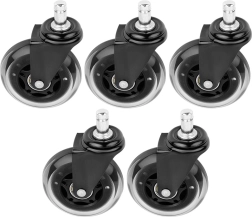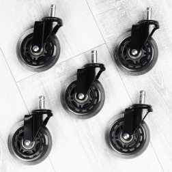 Praktisks piecu rezerves ritenīšu komplekts biroja krēsliem nodrošina klusu un vienmērīgu ripošanu pa cietām grīdām bez nepatīkamas čīkstēšanas. Gumijas pārklājums ir saudzīgs pret grīdu un vienlaikus izturīgs pret nodilumu, tādēļ ritenīši iztur ikdienas lietošanu gan birojā, gan mājās.