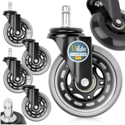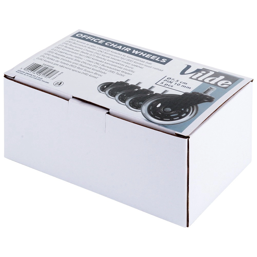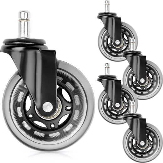 Uzlabojiet savu biroja krēslu ar klusiem un izturīgiem 75 mm kaučuka ritenīšiem ar 10 mm tapu. Komplekts 5 gab. nodrošina plūdenu un klusu kustību, grīdas aizsardzību pret skrāpējumiem un ātru montāžu bez instrumentiem. Saderīgi ar daudziem biroja krēsliem, tostarp atsevišķiem IKEA modeļiem ar tādiem pašiem stiprinājuma izmēriem.