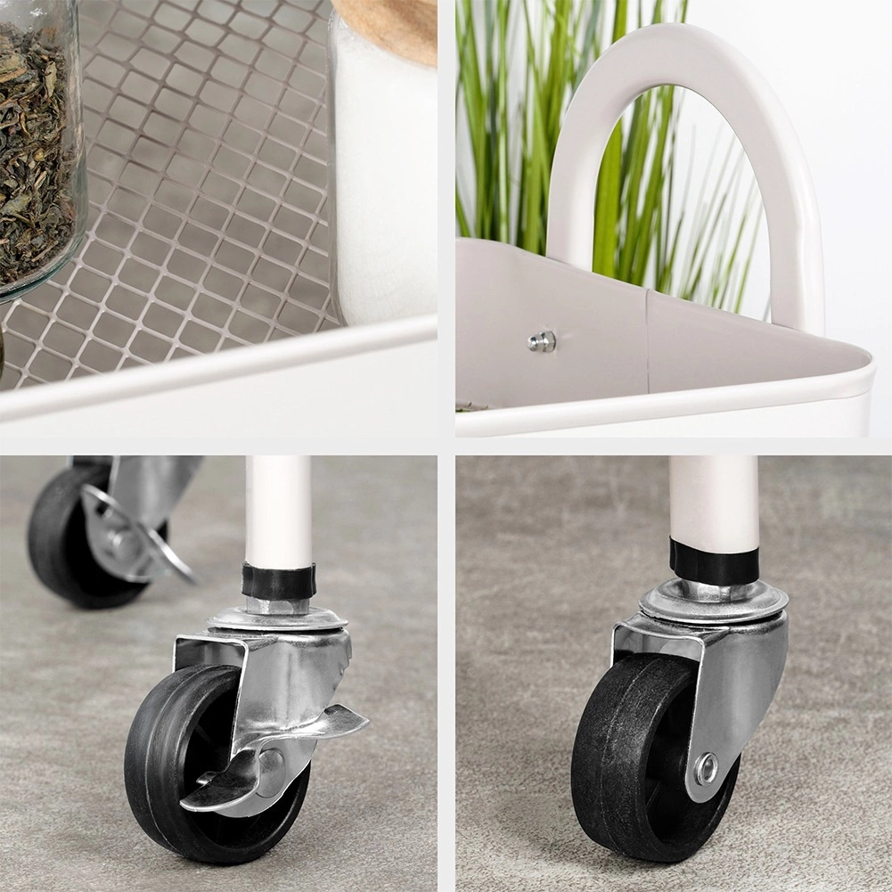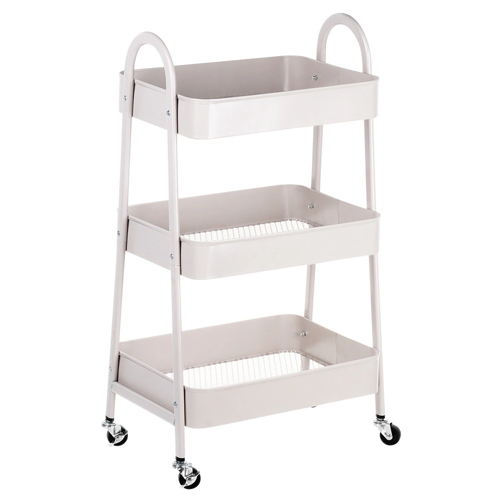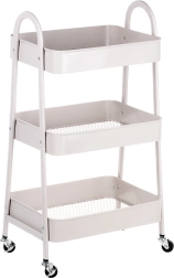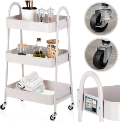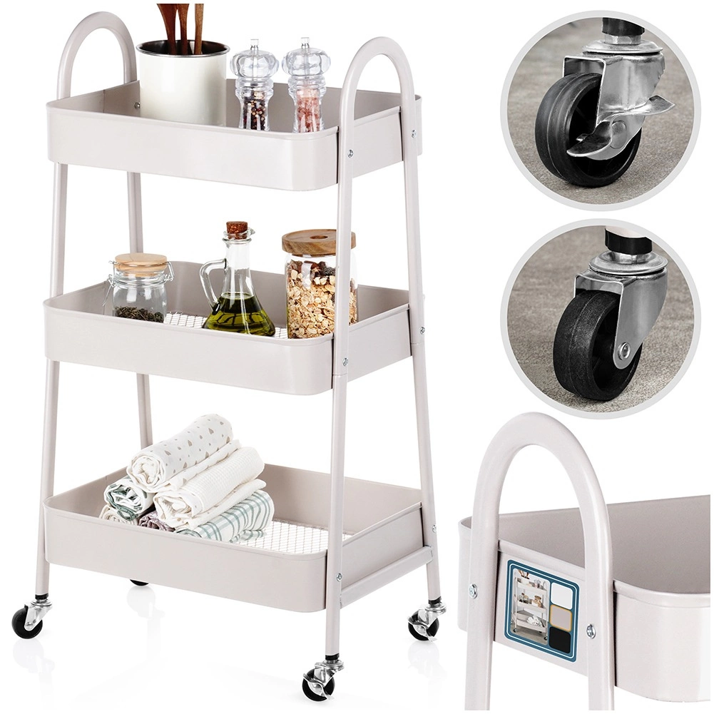 Praktisks un stilīgs pārvietojams plaukts ar trim ietilpīgām plauktu groziem piedāvā gudru risinājumu mājas organizēšanai. Pateicoties kompaktajiem izmēriem 44 × 31,5 × 78,5 cm tas iederas arī mazākās telpās, tomēr nodrošina lielu ietilpību. Stabila metāla konstrukcija bēšā krāsā un 4 ritentiņi (2 ar bremzi) garantē vieglu pārvietošanu un drošu nostiprināšanu. Ideāli piemērots virtuvē, vannasistabā, birojā un darbnīcā.