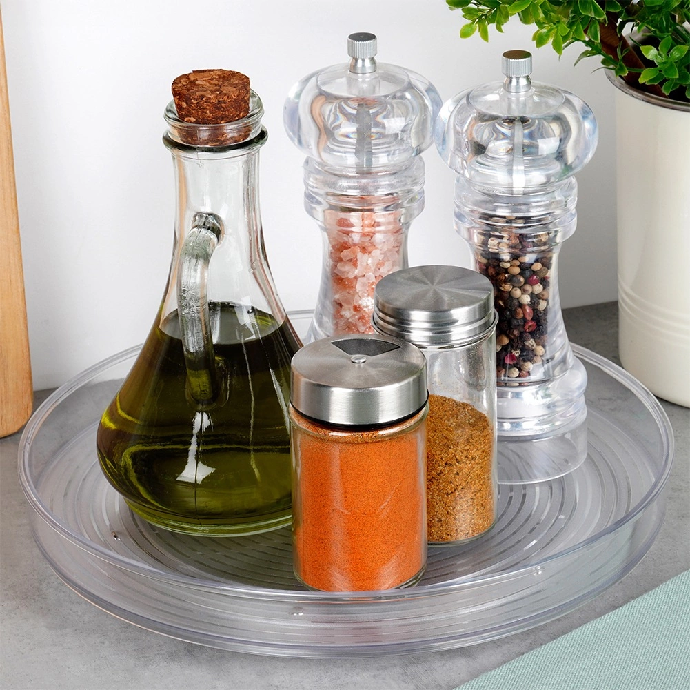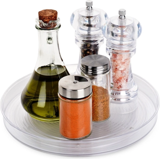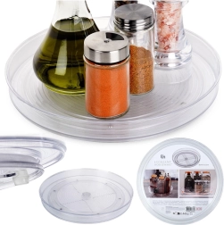 Rotējošā paplāte Lazy Susan palīdz efektīvi sakārtot garšvielas, kosmētiku, pudeles vai sīkumus mājās. Pateicoties 360° rotācijai, bez piepūles piekļūsiet visām vienībām, nepārvietojot plaukta vai skapīša saturu. Caurspīdīgā plastmasa nodrošina tūlītēju pārskatu par uzglabātajiem priekšmetiem.