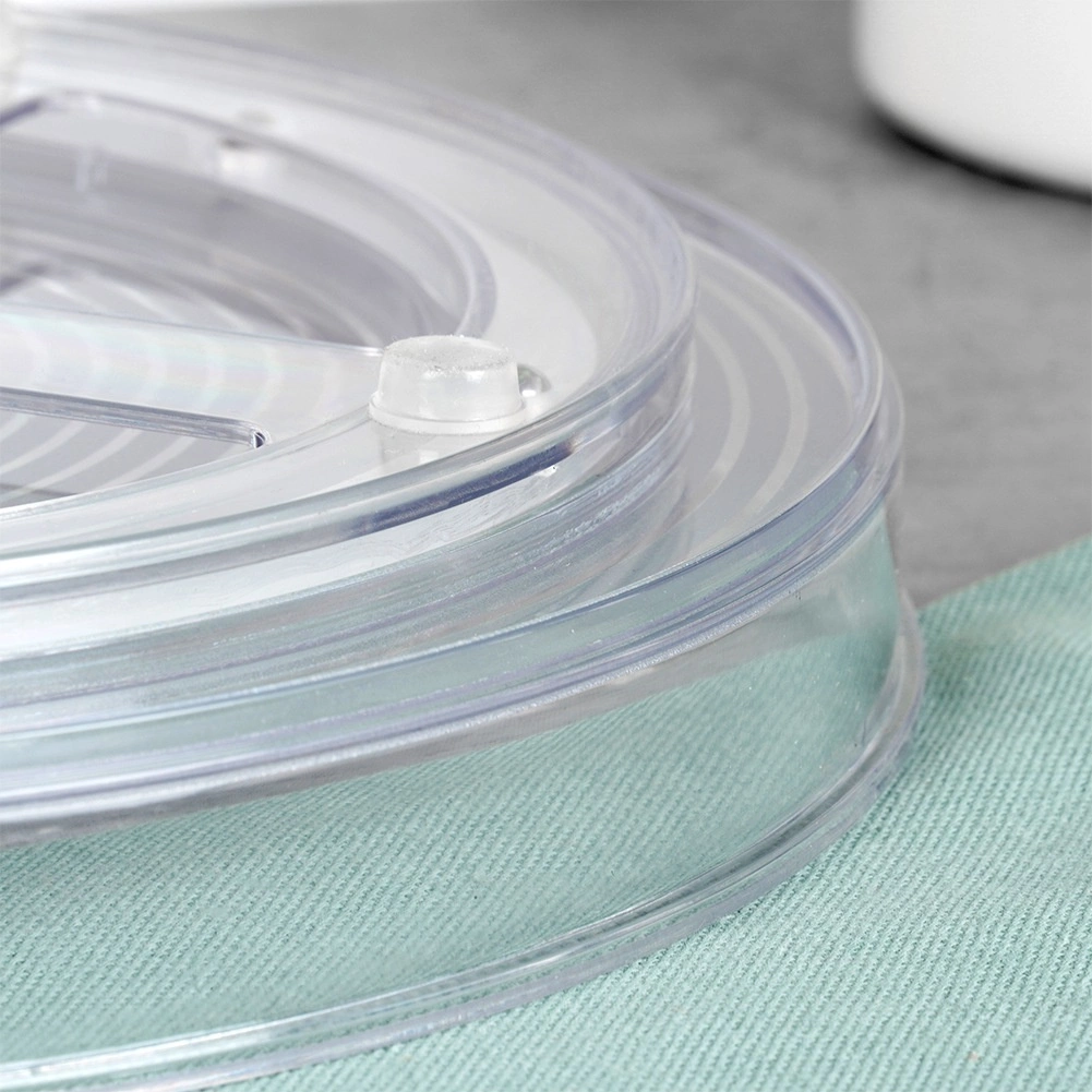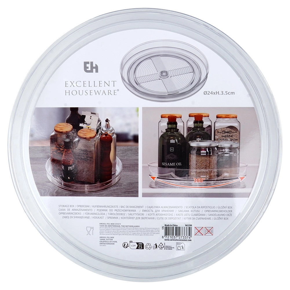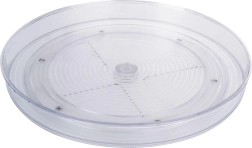 Praktisks rotējošais organizators ar diametru 24 cm un augstumu 3,5 cm nodrošina kārtību virtuvē, vannasistabā un pieliekamajā. Pateicoties pamatnei ar 360° griešanos, viss ir uzreiz pa rokai. Caurspīdīgais dizains atvieglo pārskatu par ievietotajām lietām, taupa vietu ledusskapī, skapīšos un uz plauktiem, kā arī viegli tīrāms ar vienkāršu noslaucīšanu.