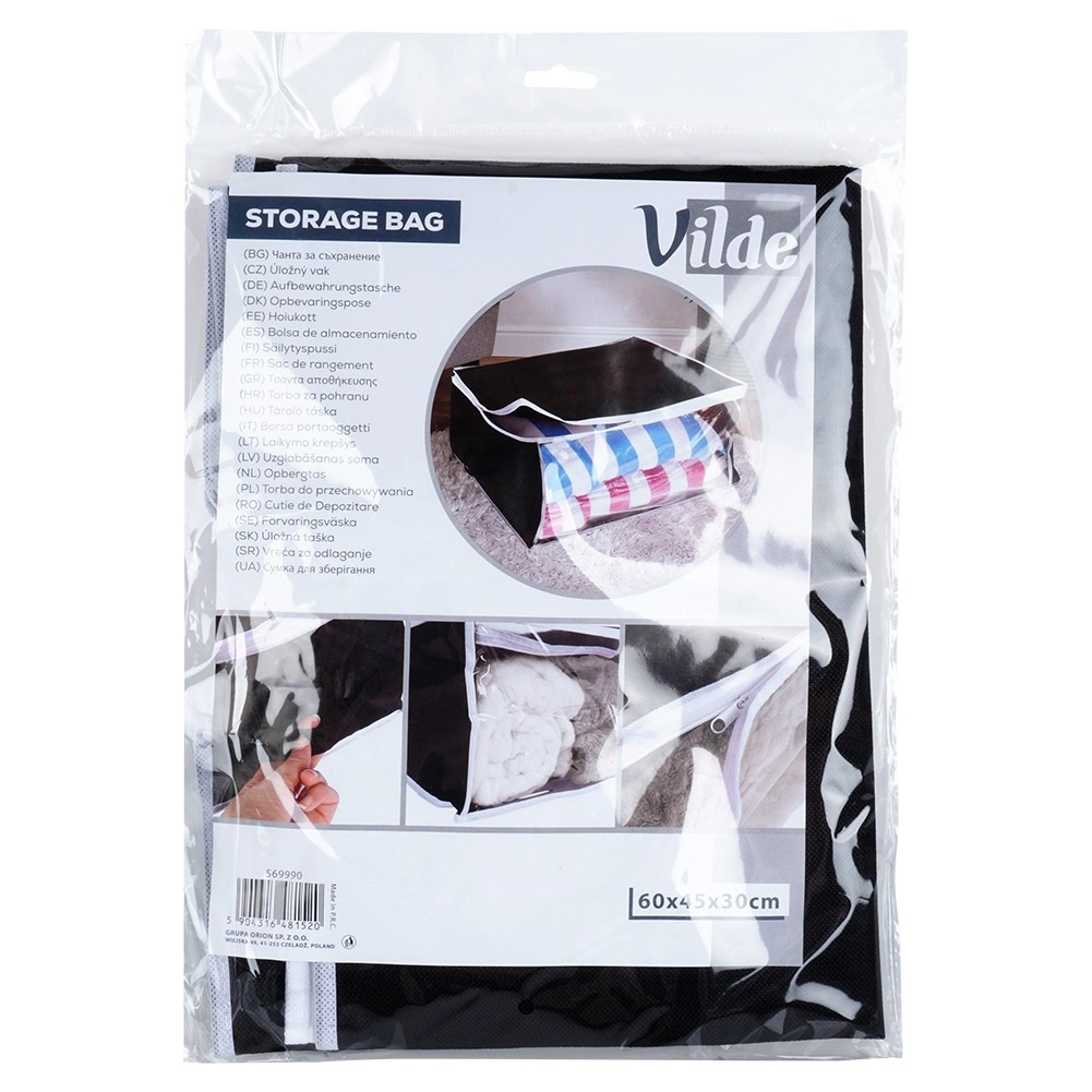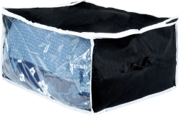 Atklājiet gudru risinājumu mājas organizācijai. Šis uzglabāšanas maiss no izturīga poliestera auduma melnā krāsā ir aprīkots ar stingriem sānu rokturiem, caurspīdīgu lodziņu ātrai satura pārbaudei un divkāršu rāvējslēdzēju vienkāršai un ciešai aizvēršanai. Ideāli piemērots sezonālajiem tekstilizstrādājumiem, gultasveļai un apjomīgam apģērbam.
