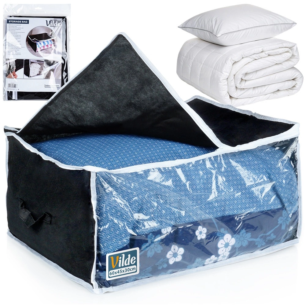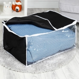 Praktisks uzglabāšanas maiss gultasveļai, segām, spilveniem un apģērbam pasargā lietas no mitruma, putekļiem un kožu bojājumiem. Pateicoties izmēriem 65 × 45 × 30 cm un 87 l tilpumam tas piedāvā lielu uzglabāšanas vietu, ērti glabājas skapī vai zem gultas un nodrošina ātru pārskatu ar caurspīdīgo lodziņu.