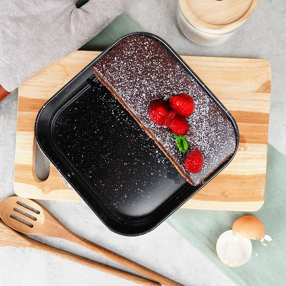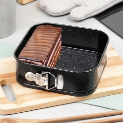 Kvadrātveida forma ar izmēriem 20 × 20 × 6,8 cm ir lieliska izvēle ikdienas cepšanai. Izturīgais oglekļa tērauds nodrošina stabilitāti un vienmērīgu siltuma sadali, bet granitveida pārklājums mazina pielipšanu pat lietojot nelielu taukvielu daudzumu. Pateicoties atveramai malai un izņemamam dibenam gatavo desertu var izņemt, nesabojājot formu.